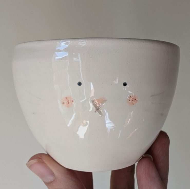 I enjoy making these little character pots, each little bunny face although similar because they are made by hand they have their own personality. The little cotton tail is an extra little detail.