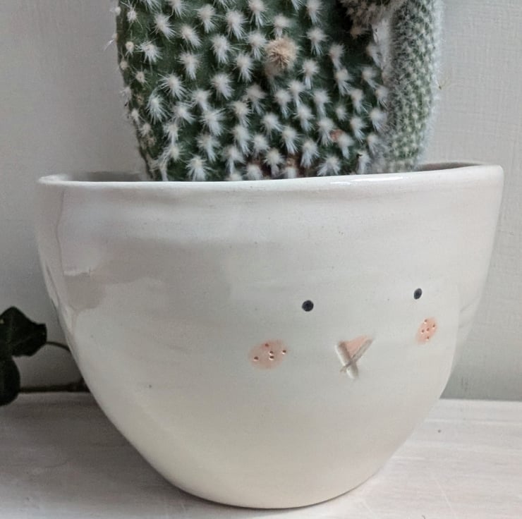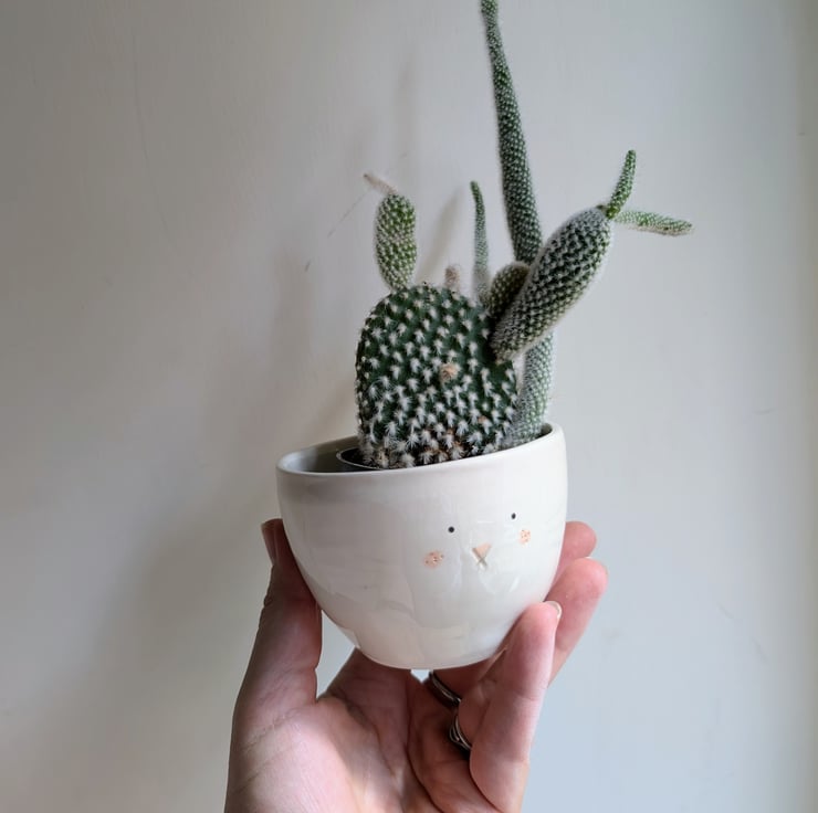 Little hand thrown pottery bunny plant pot with hand painted face and little 3D cotton tail. Perfect little pot for bunny earred cactus or succulent.