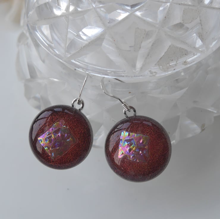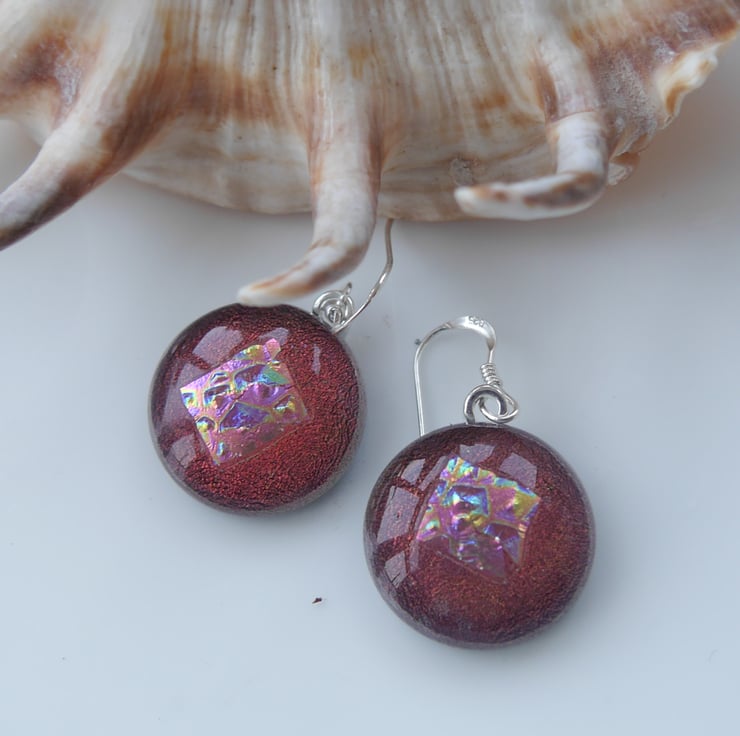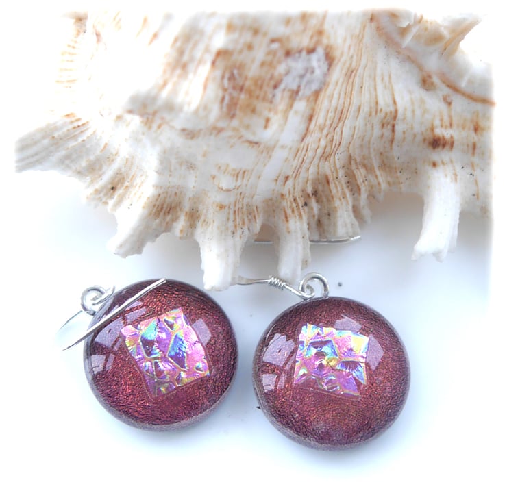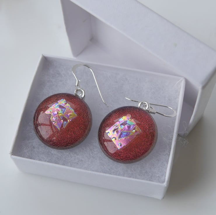 Note that though in some photos the earrings may look to be different colours this is because of the two colour quality of the dichroic, they are both cut from contiguous pieces of glass