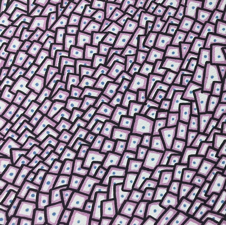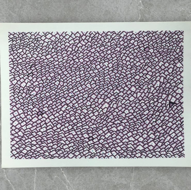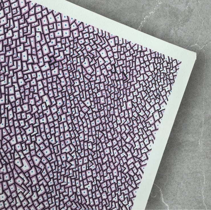 This abstract illustration is the result of an intuitive drawing session, the process started with selecting a colour combination. Pink, blue and black. I started in one corner with the eye shape, which is frequently featured in my work. As I continued the process my thoughts went to how we can feel both invisible and excessively watched at times. Also, there can be pressure to put out an image of ourselves and our lives that is not representative of our true day to day for all to see. I decided on the final title of 'I See You', the alternative was 'I'm Watching You' which made me feel quite uneasy, whereas 'I See You' has more positive connotations.