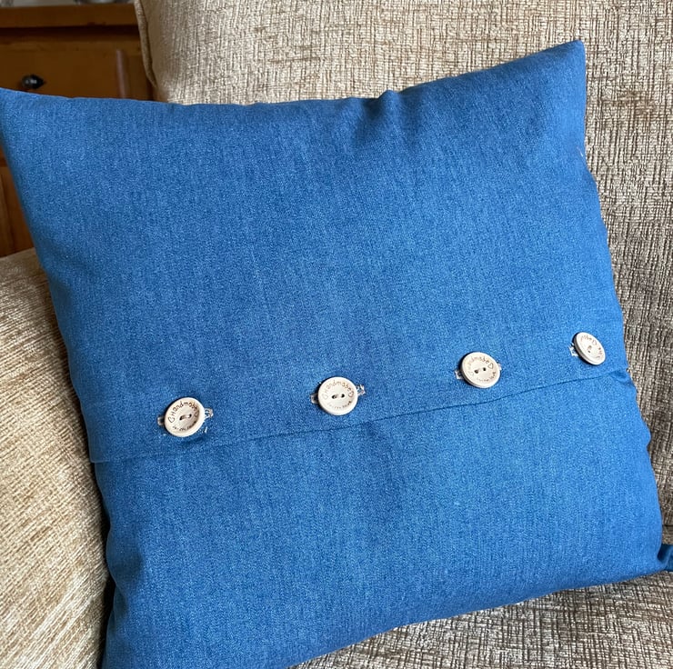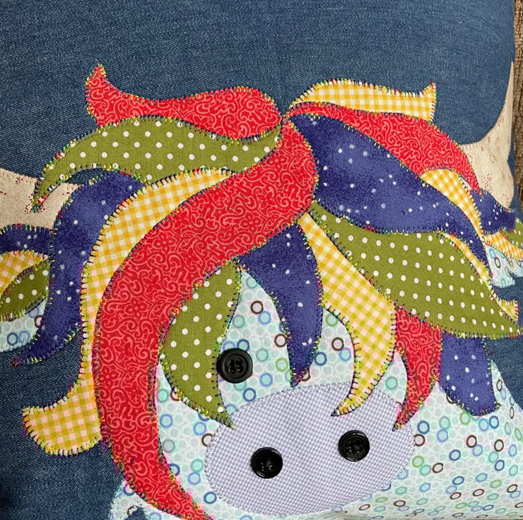 A bit of the Highlands of Scotland for your home. This cheerful Highland Coo will make a lovely bright centre point for any room. This cover is a blend of rustic charm and a vibrant personality, with the coo's woolly coat a patchwork of bright colours. The denim makes all the colours pop. The wooden button fastening is practical, yet shows the love that went into the making of this cushion cover. It would make a fantastic gift for anyone, or one just for yourself.