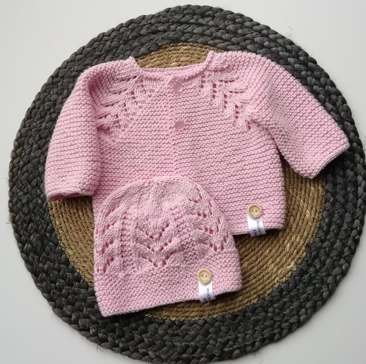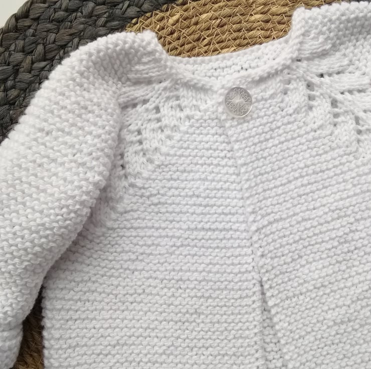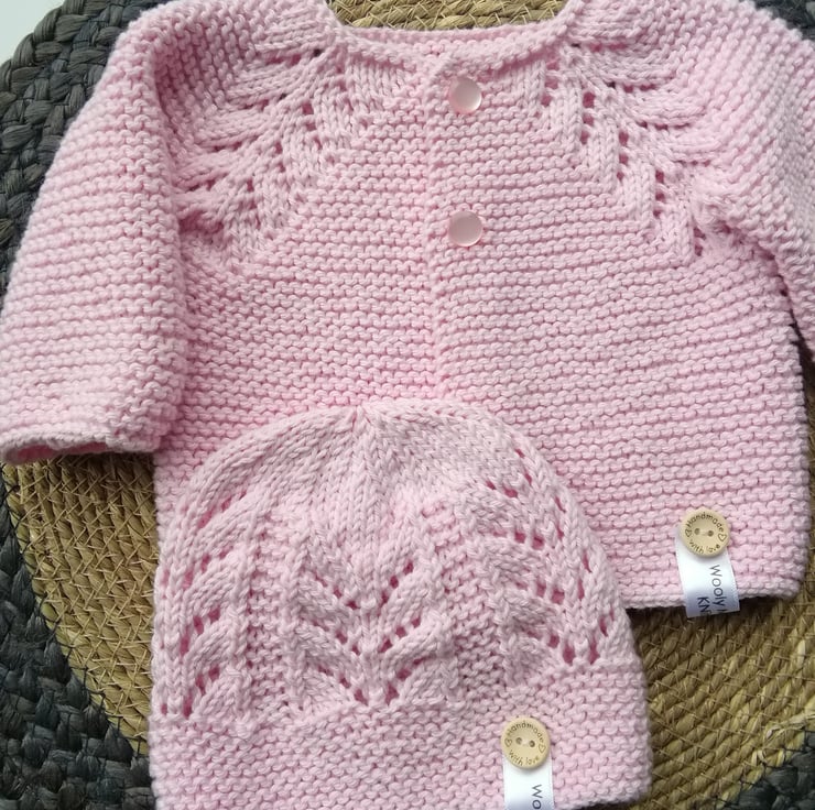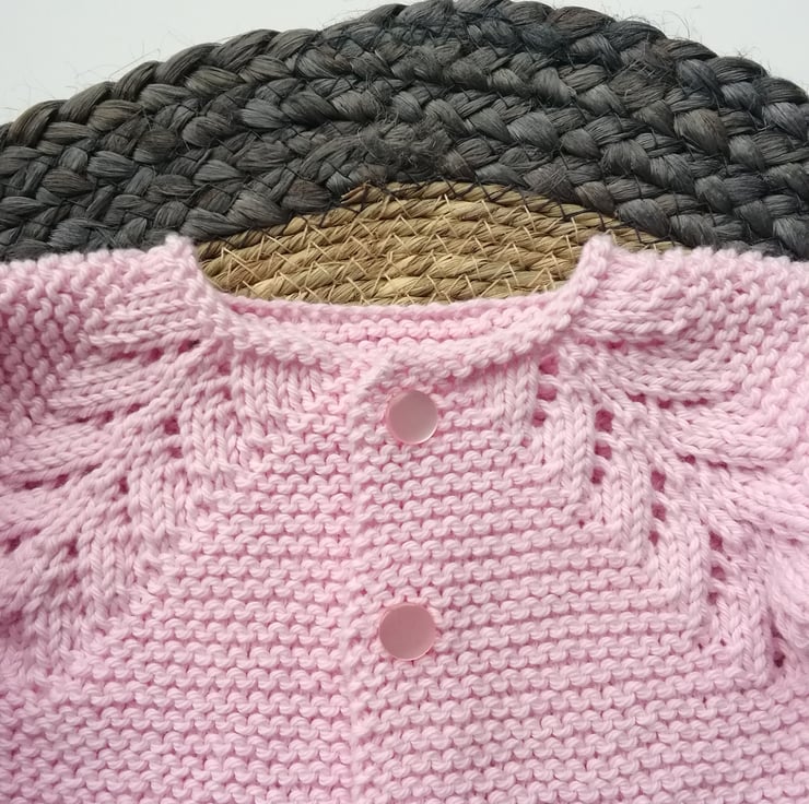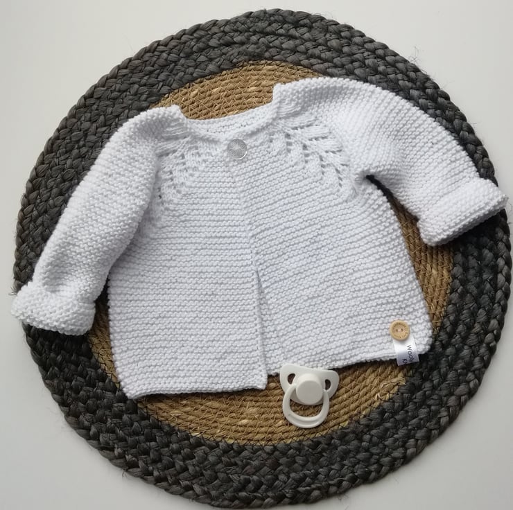 Hand knitted cardigan with fancy panel at armhole shapings, matching buttons to front and my branding tag