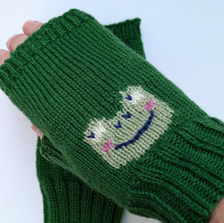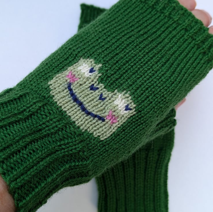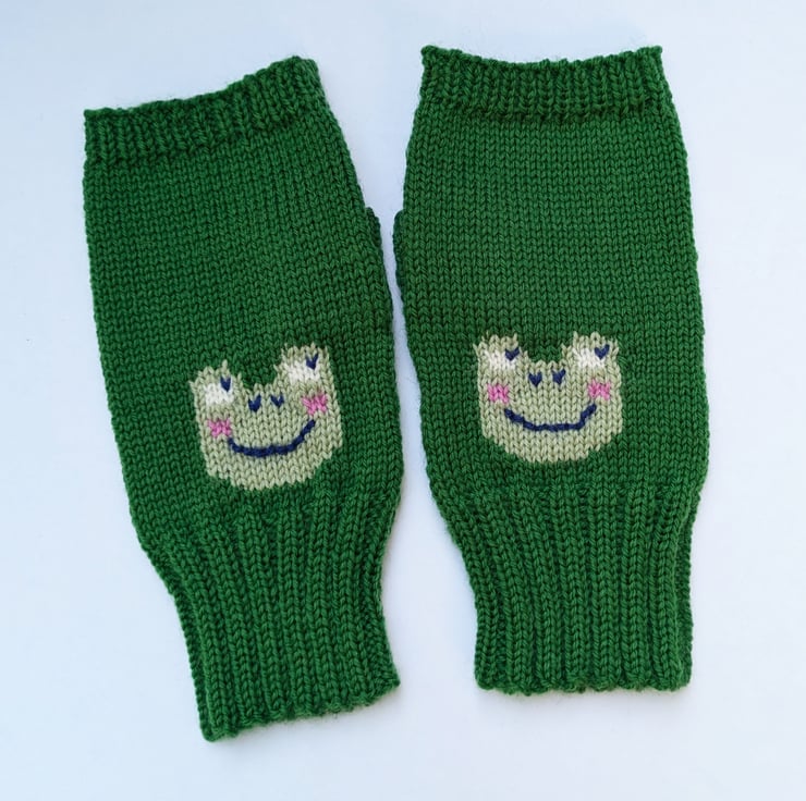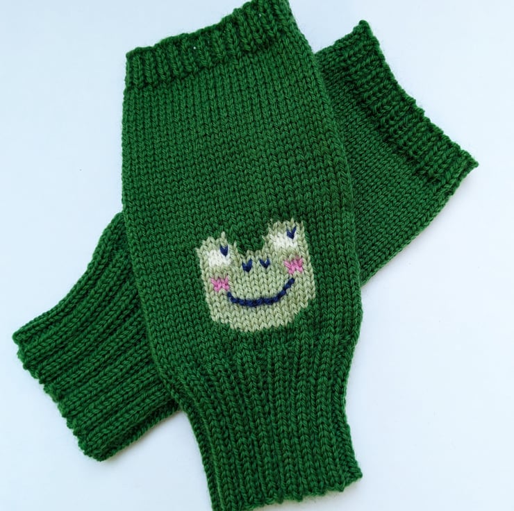 Fun fingerless gloves knitted in 4ply merino wool with a frog face on the front. Handmade on a vintage knitting machine. These wrist warmers are ideal for wearing in a cold office, studio, home when doing tasks as they keep your hands warm but fingers free.