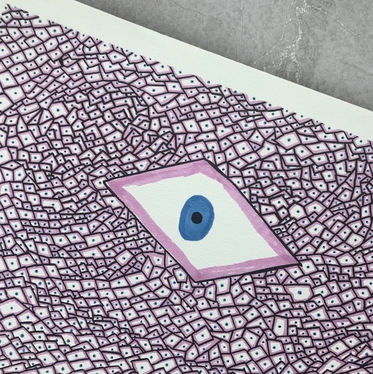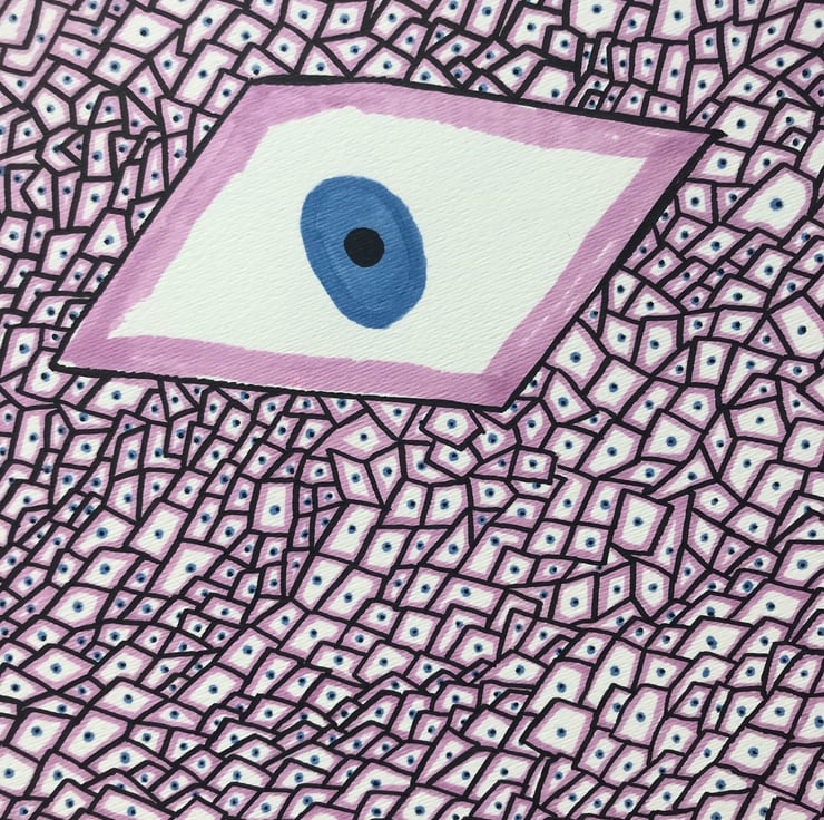 Intuitive drawing. I started in one corner with the eye shape, which is frequently featured in my work. As I continued the process my thoughts went to how we can feel both invisible and excessively watched at times. Also, there can be pressure to put out an image of ourselves and our lives that is not representative of our true day to day for all to see. I decided on the final title of 'I See You', the alternative was 'I'm Watching You' which made me feel quite uneasy, whereas 'I See You' has more positive connotations.