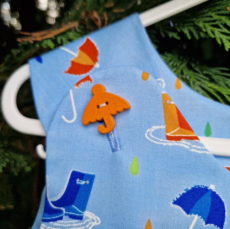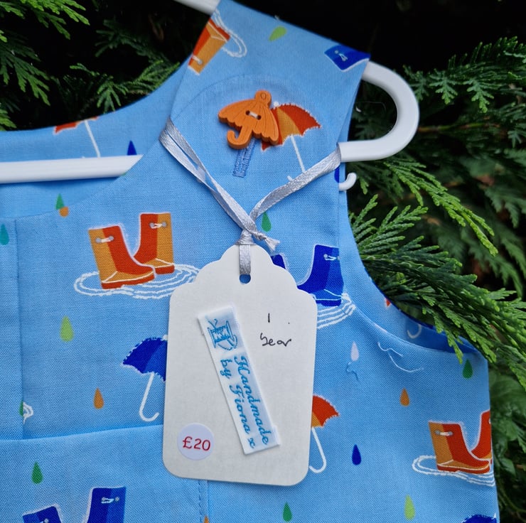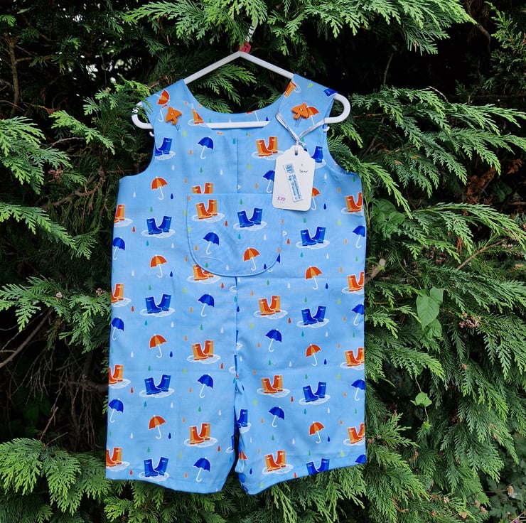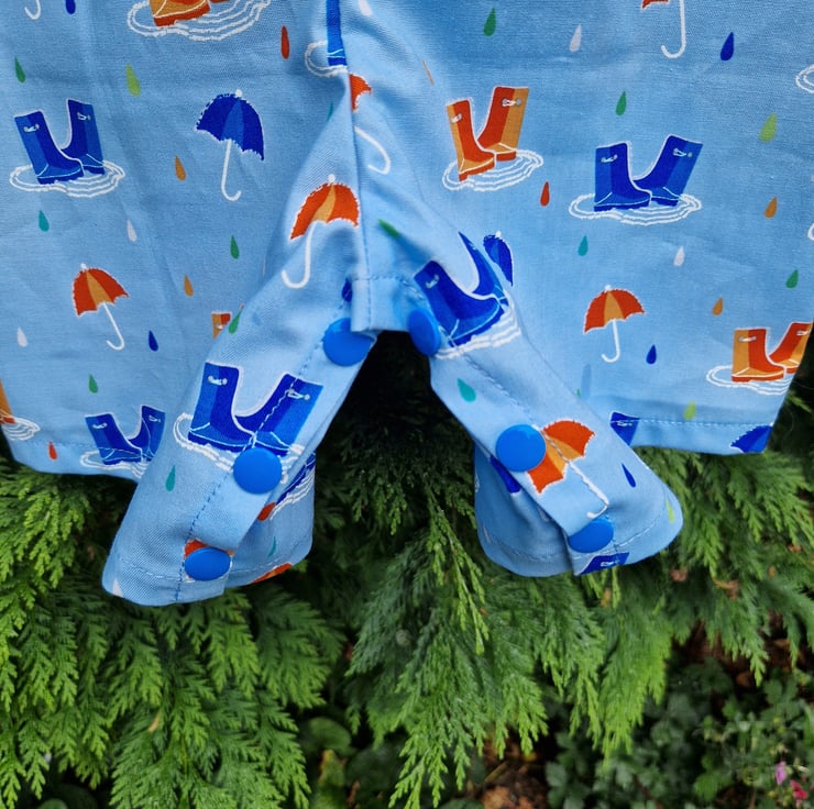 Age 1 year approx, pair of light weight pale blue cotton roomy rompers with a print of orange and blue wellies in puddles and orange and blue umbrellas and raindrops and a centre feature chest patch pocket detail, with wooden orange umbrella shaped buttons and blue poppers at the gusset for easy opening for nappy changes.
