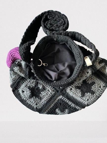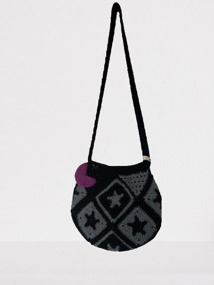 Handcrafted with love, this crochet handbag features striking black and grey stars and a unique accessory moon. Stay organized with the fully lined interior and handy key hook. Bring a touch of whimsy to your outfit with this one-of-a-kind bag.