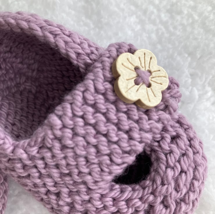 Hand knitted baby shoes. I have knitted these ultra cute baby shoes in a super soft mulberry coloured cotton yarn and finished them with a flower-shaped carved coconut shell button on the chunky straps.