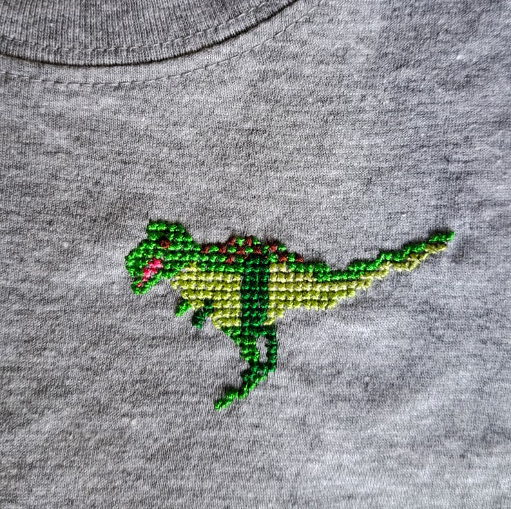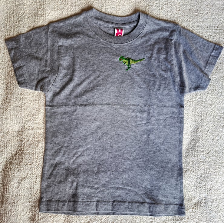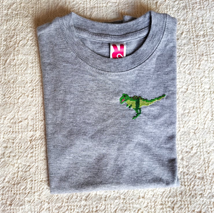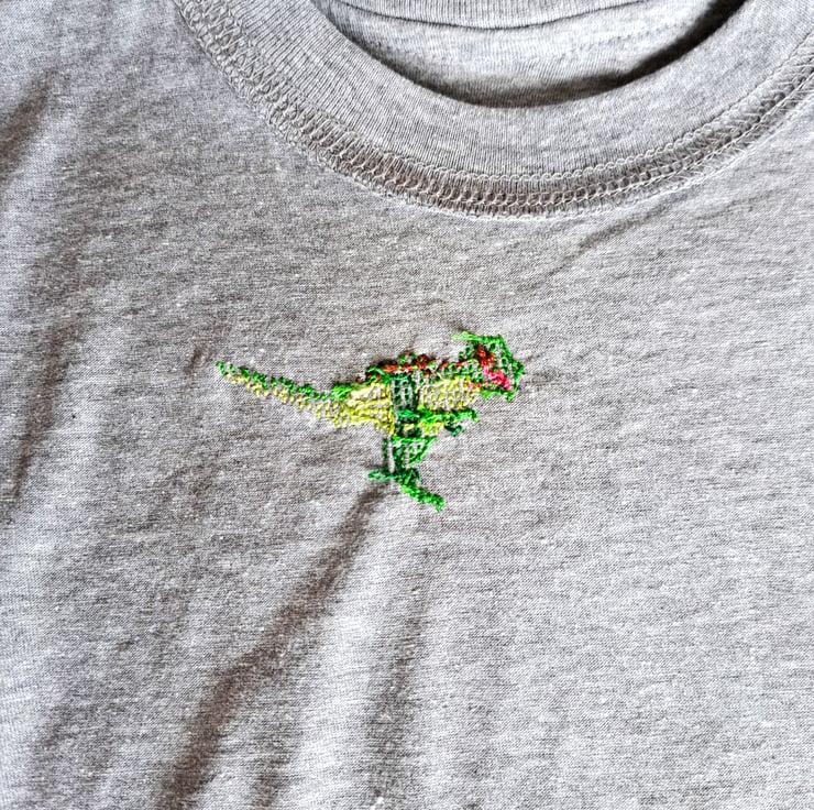 On this lovely soft grey marl T-shirt I have hand embroidered a running tyrannosaurus in various shades of green, with a chestnut brown eye and brown spots on its back. As I never use a permanent backing material when embroidering kids' clothing, there is nothing inside the shirt to irritate your child's skin. The shirt has short sleeves and a round neck. It is cotton polyester and can be machine washed.