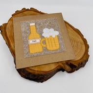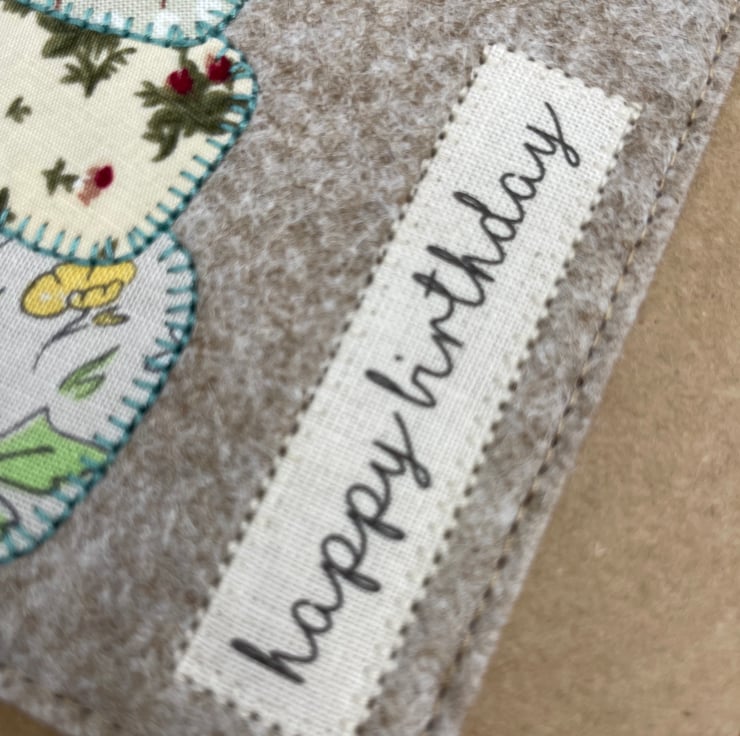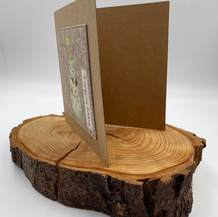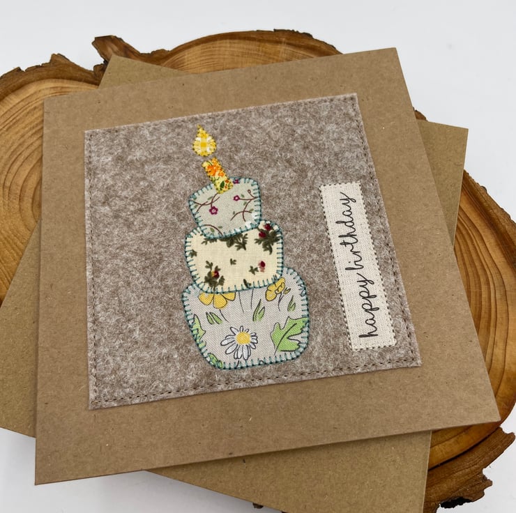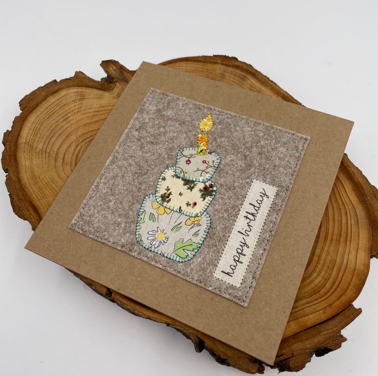 This recycled card features a 3 layer birthday cake and candle appliquéd onto woollen felt. It is stitched with blanket stitch, with a happy birthday embellishment.