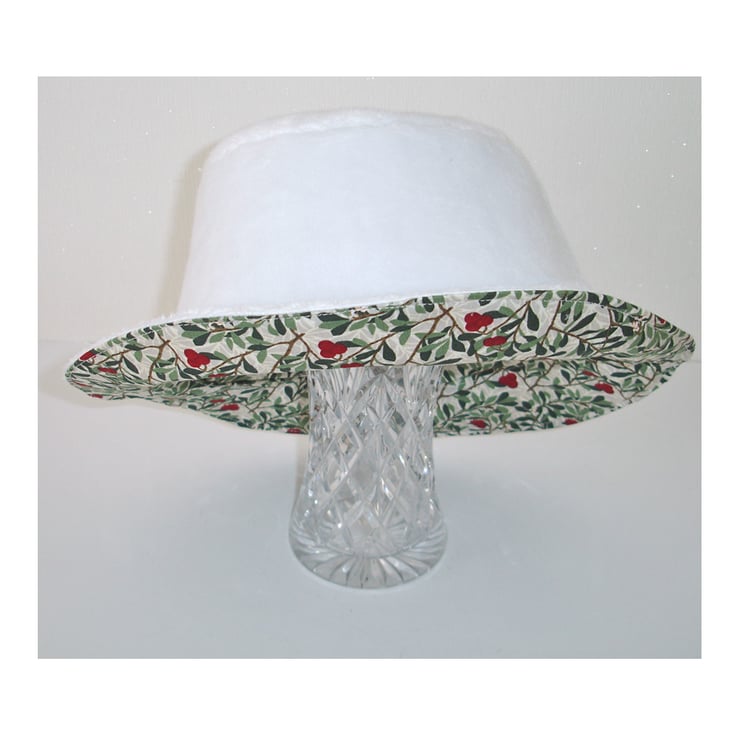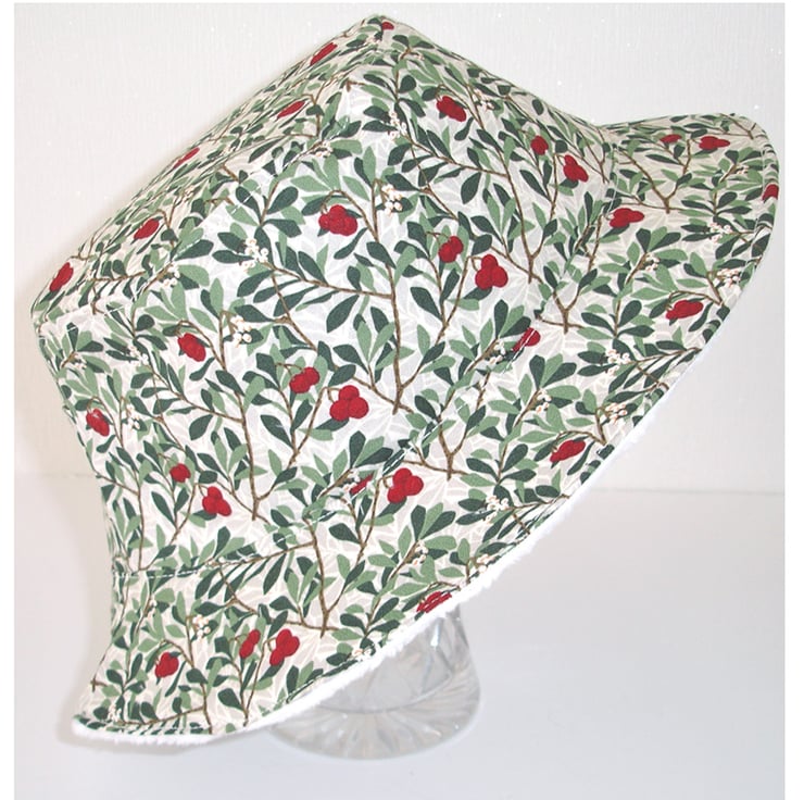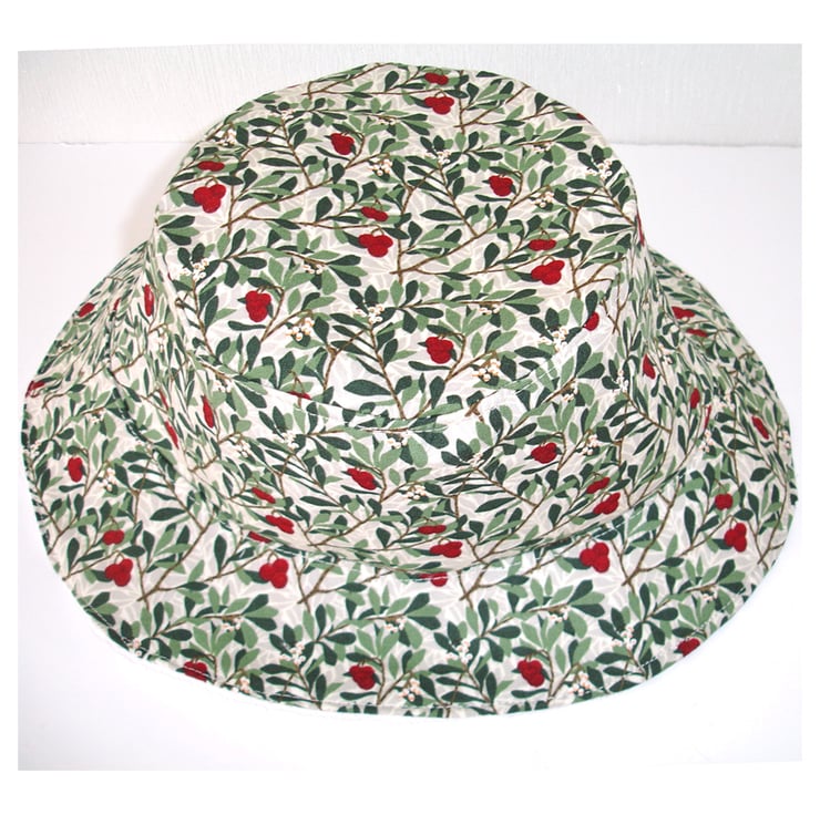 This is a carefully handmade bucket style hat created using a beautiful William Morris design fabric "Winter Garden Arbutus". Featuring berries in red, green, ivory and beige.
