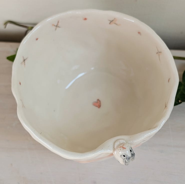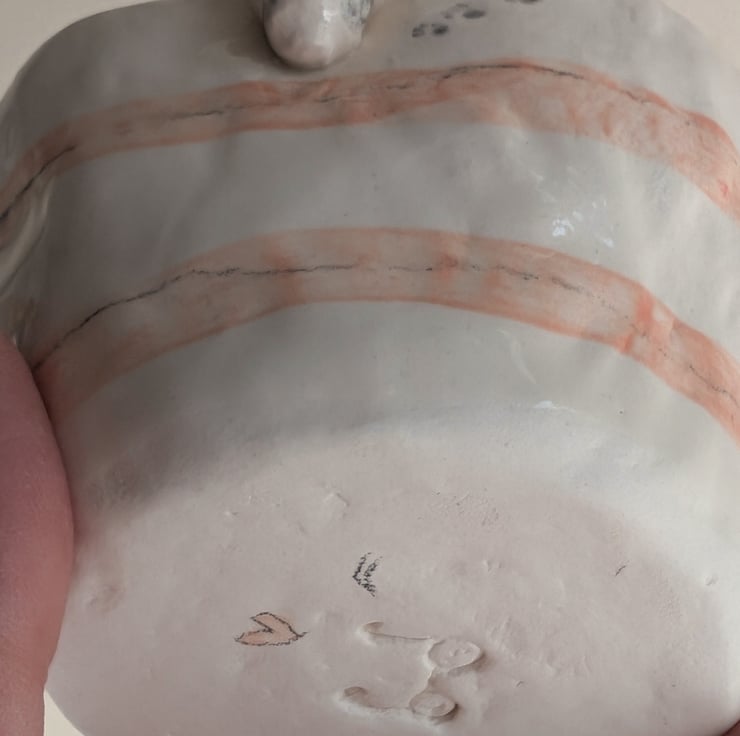 Hand pinched little tealight pot. The bunny was modelled and attached prior to bisque firing along with footsteps pushed into the clay . The piece was then hand painted and the whole pot dipped in clear lead free glaze prior to the final firing .