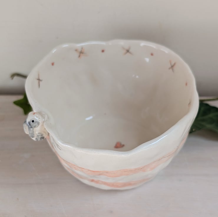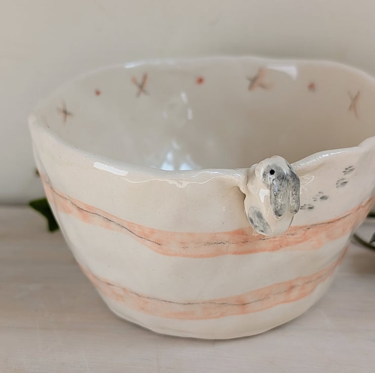 Gift for bunny lover. There is a tiny hand modelled and painted rabbit on the side with little pawprints in white clay with handpainted stripes and clear shiny glaze .