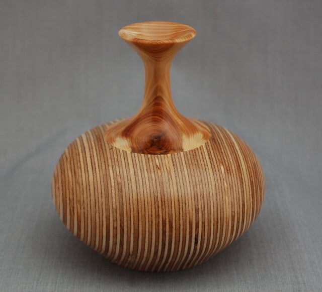 Slanted, horizontal, concentric, arching shapes of Nordic ply in this vessel of endless interest. The sumptuous, curvaceous base is made of compiled, assimilated and compressed layers of Baltic plywood, giving this final fascinating result. Hand turned by Randal it is completed with a graceful neck home-grown yew. Stand it as it comes, with dried grasses or flowers, or twig-found on a memorable walk? It measures approximately 11 cm high and 11 cm in diameter.