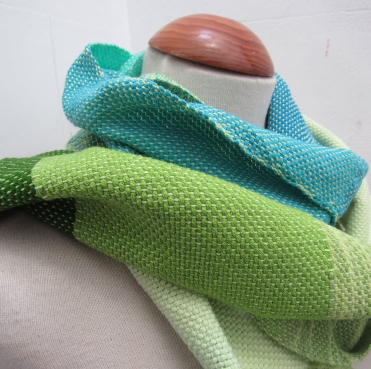 Hand woven from salvaged and scrap fibres, this cotton scarf is woven from commercial and hand-dyed blue and green cotton yarns.