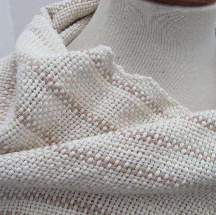 Hand woven from a a collection of cream, ecru, light brown and grey cotton yarns, this is perfect for cooler summer days as it is generously sized and has a comforting weight