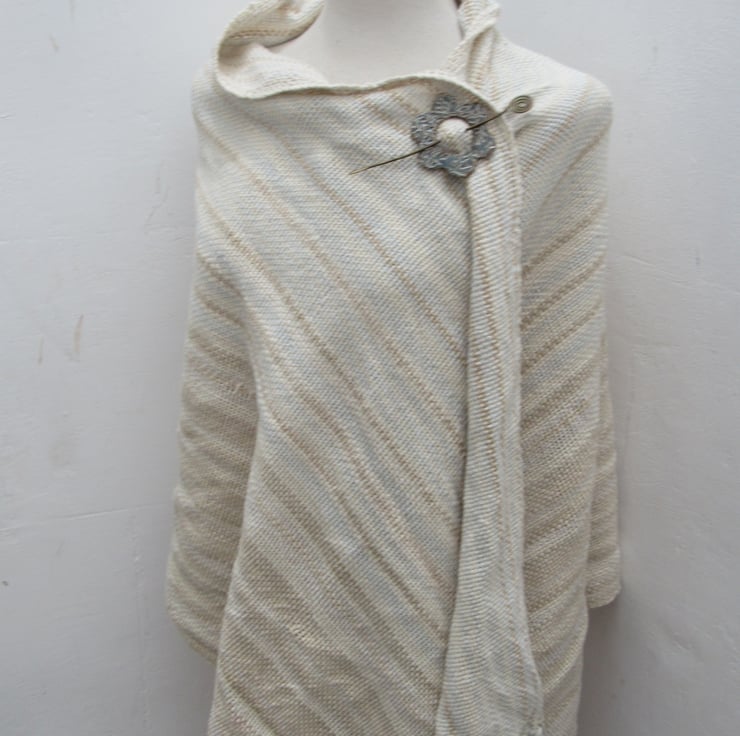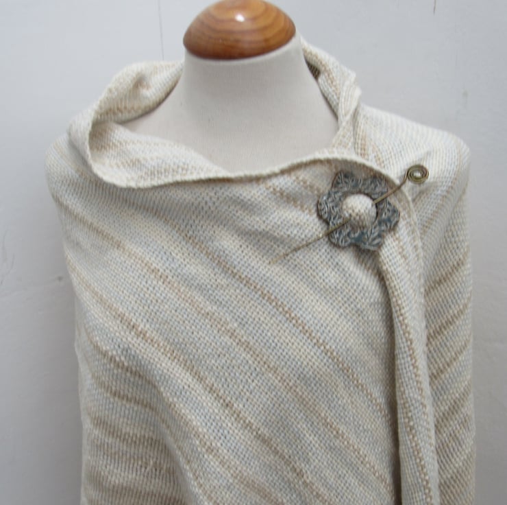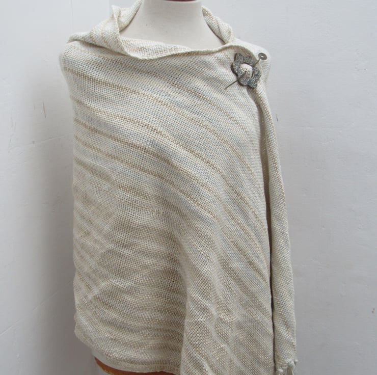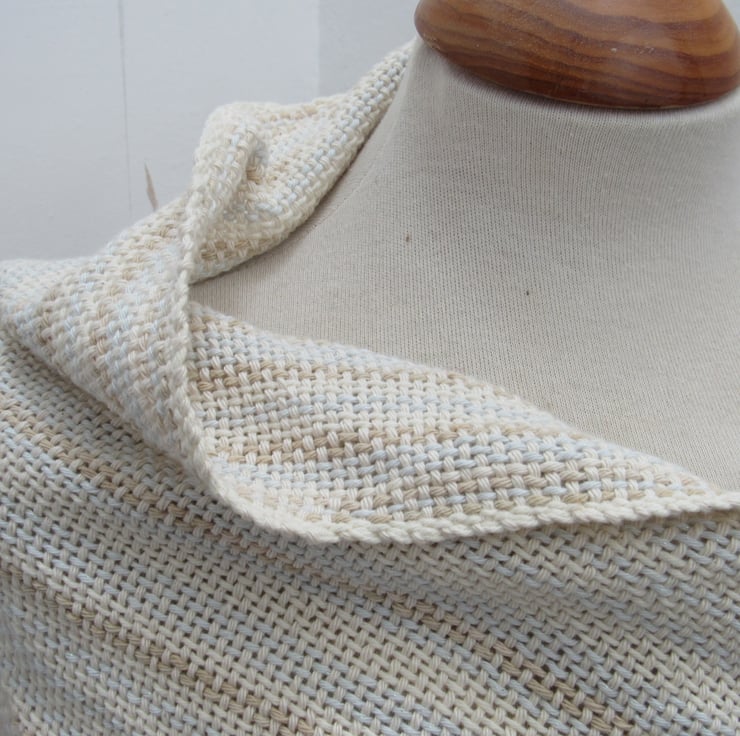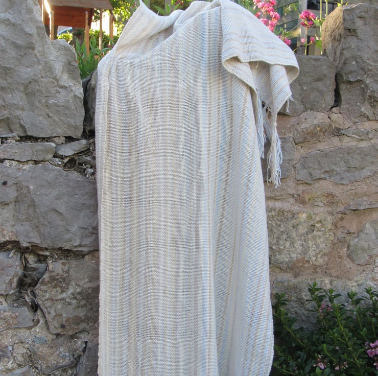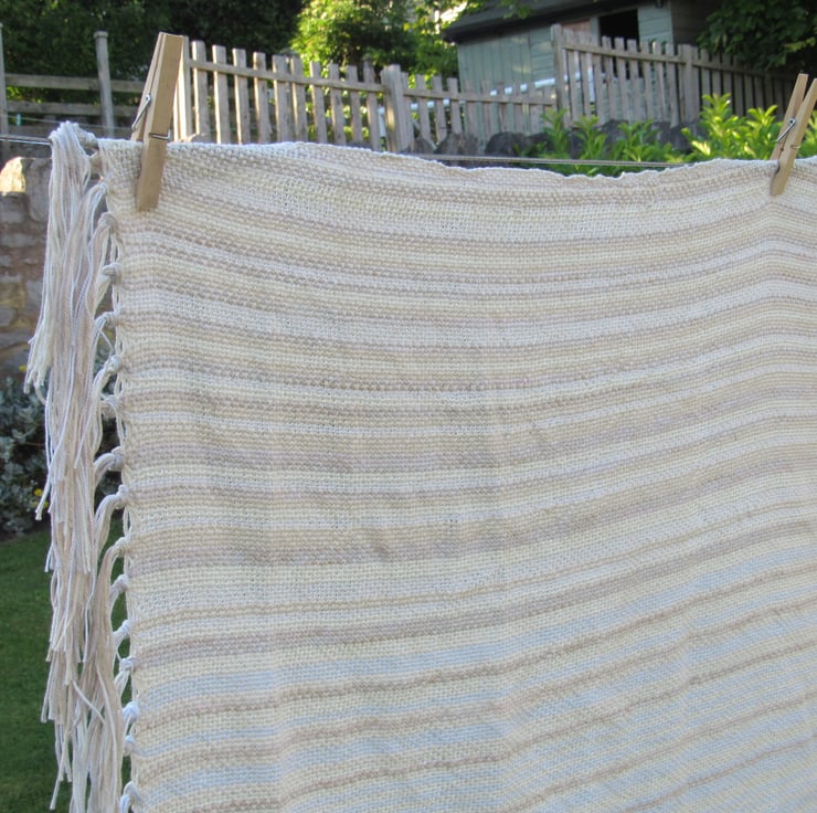 Hand woven from a a collection of cream, ecru, light brown and grey cotton yarns, this is perfect for cooler summer days as it is generously sized and has a comforting weight