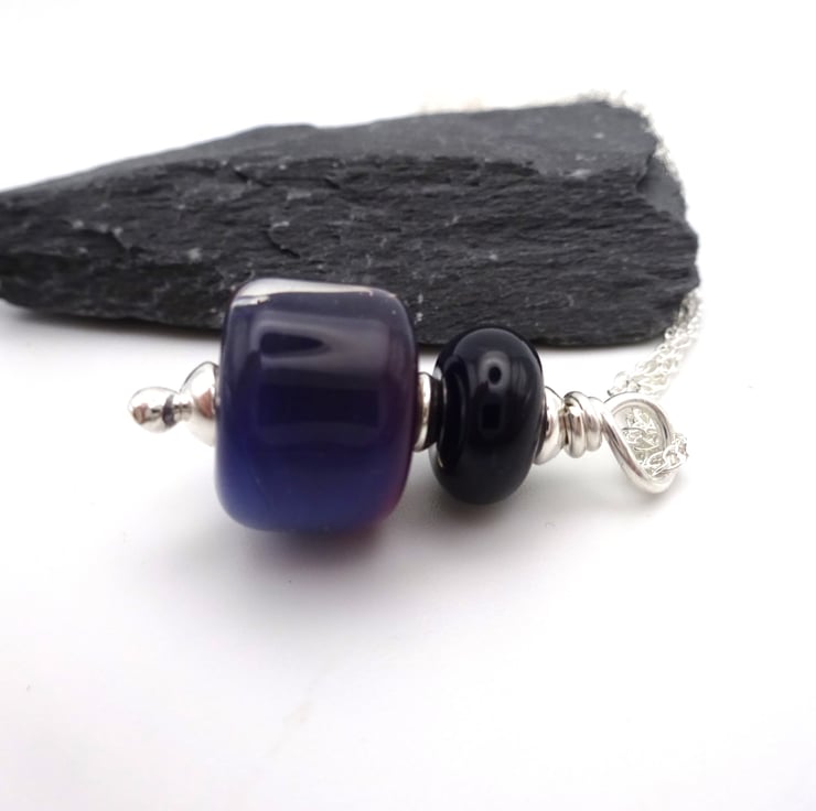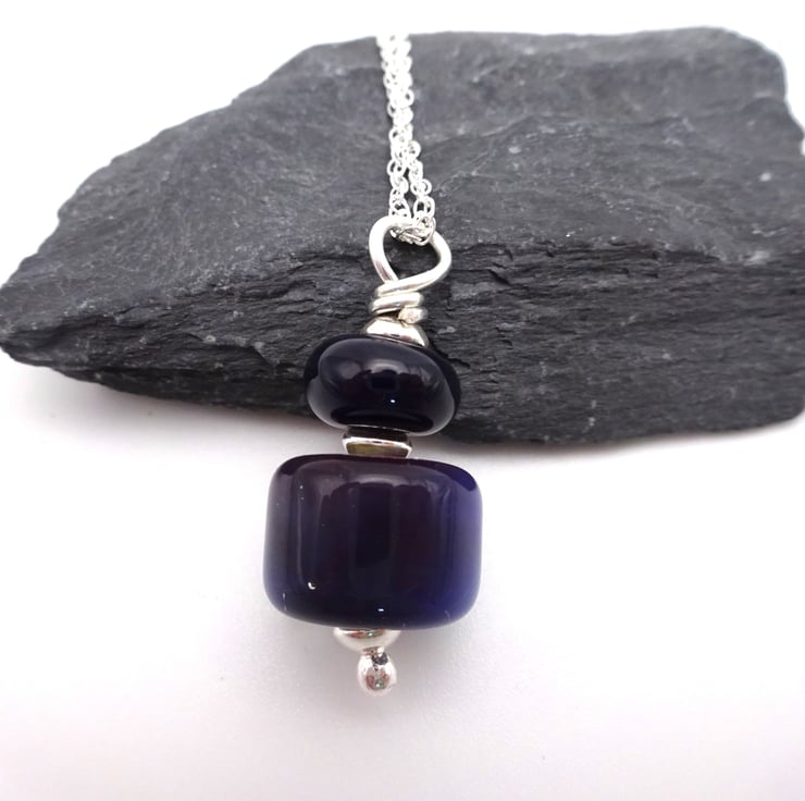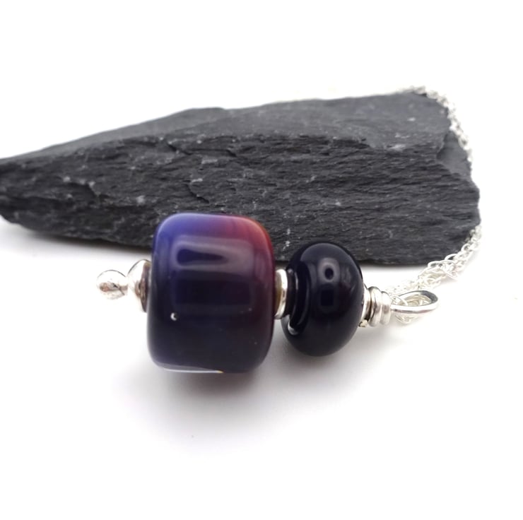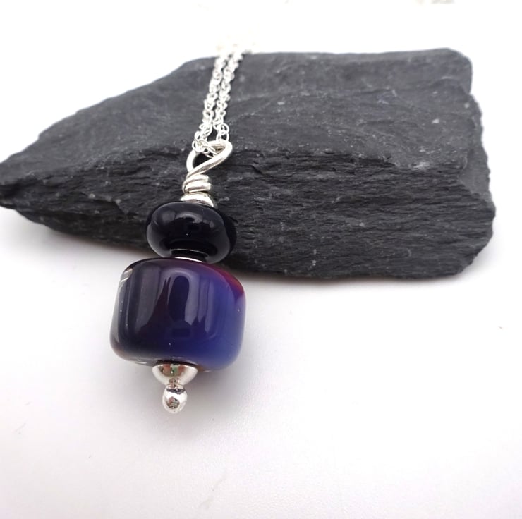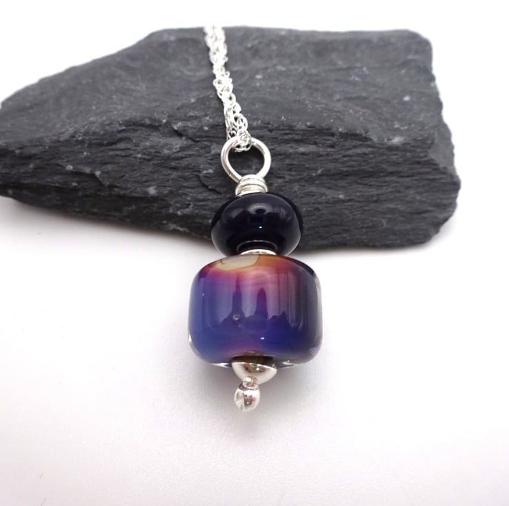 It features a handmade lampwork glass pendant strung onto a sterling silver chain.