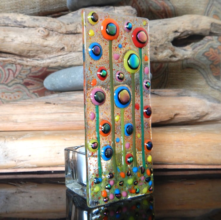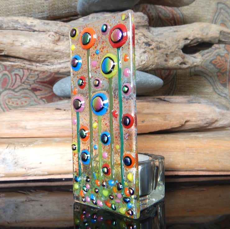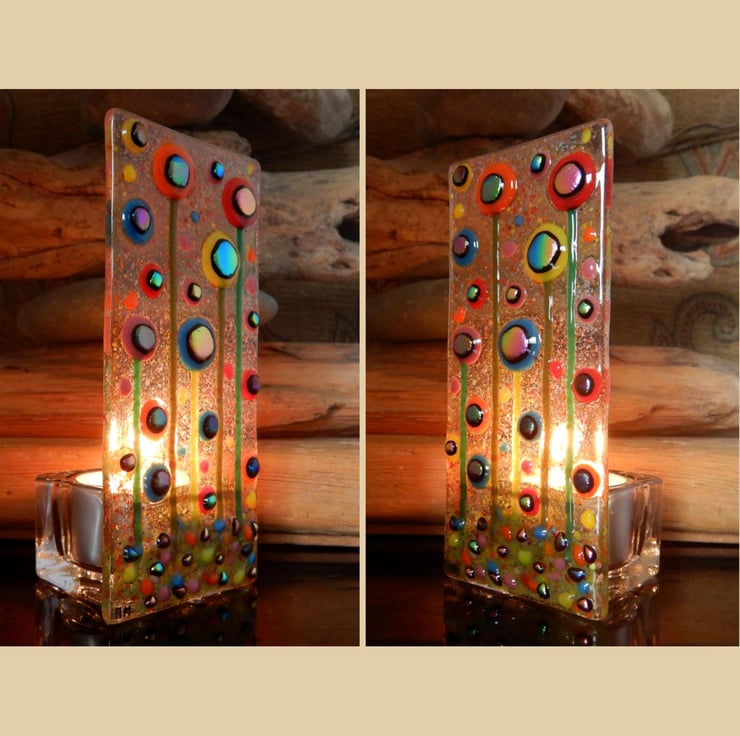 Lovely, bright, colourful, and cheerful T-light holder. Carefully made by myself using bullseye glass, dichroic glass, and frit glass. Each piece of glass was positioned carefully to make sure that the composition was balanced, and that it would have maximum visual impact.