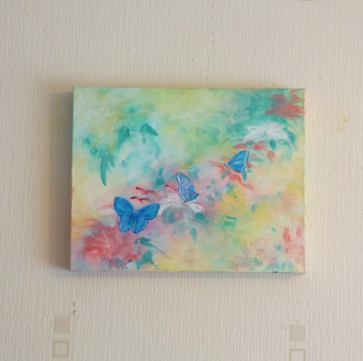 Contemporary painting of flowers and butterflies.Painted in acrylic on a 14in x 11in box canvas