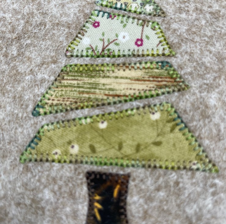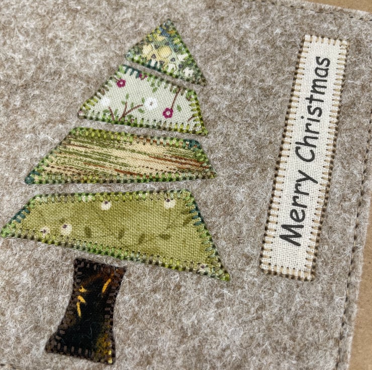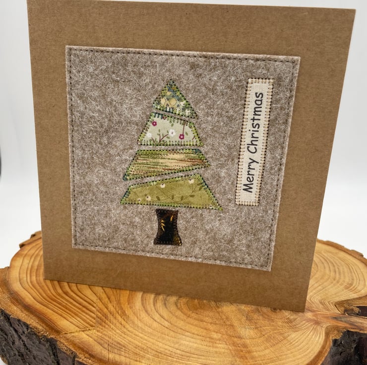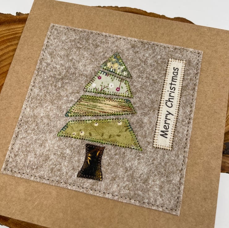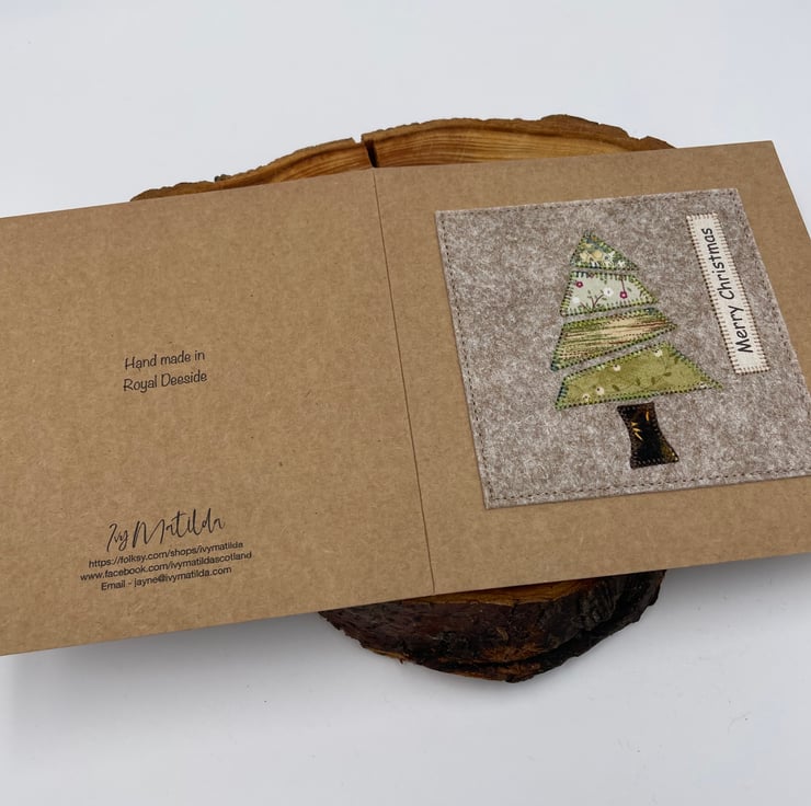This charming appliqué Christmas card features a Christmas tree, lovingly stitched from fabric scraps. The tree stands tall and merry, bringing a warm, handmade touch to your holiday greetings. The inside is left blank for your own heartfelt message, making it perfect for adding that personal, festive touch to someone's season. This card can be framed making it a perfect keepsake gift.