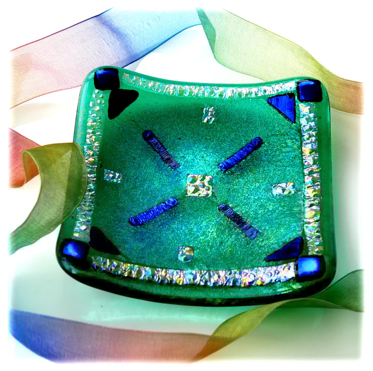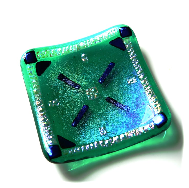 This little dish is really extra special, its gloriously bright emerald colouring and extravagent dichroic glass decoration.