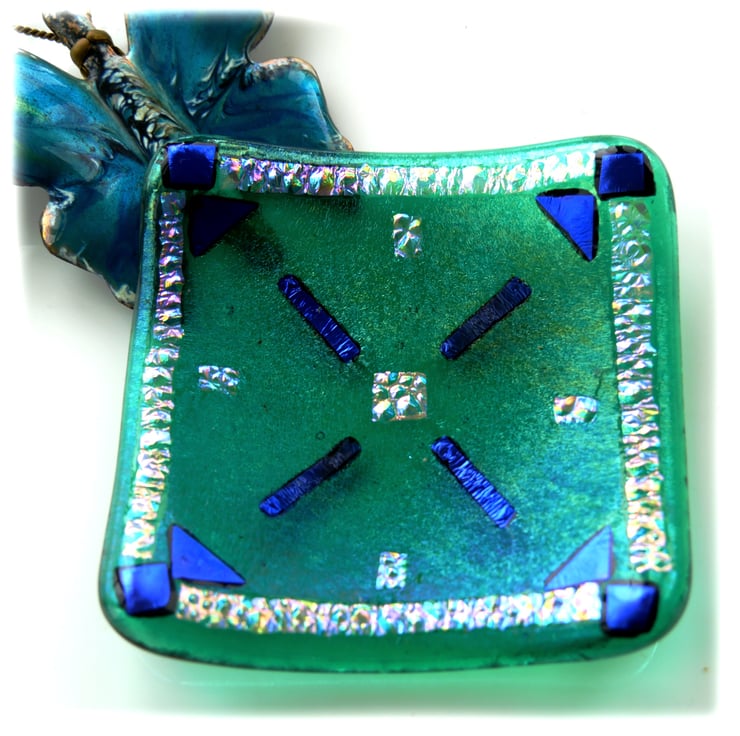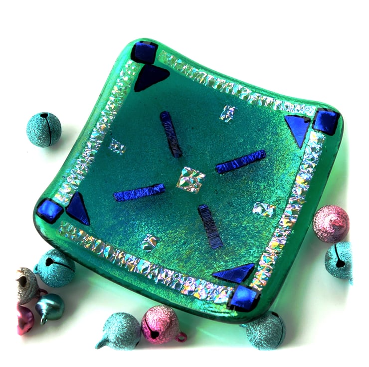 A little, 9.5cm square dish, twice times fired in my kiln, first to full fuse all the glass together, 2nd to slump it over a little mould into a shallow dish shape.