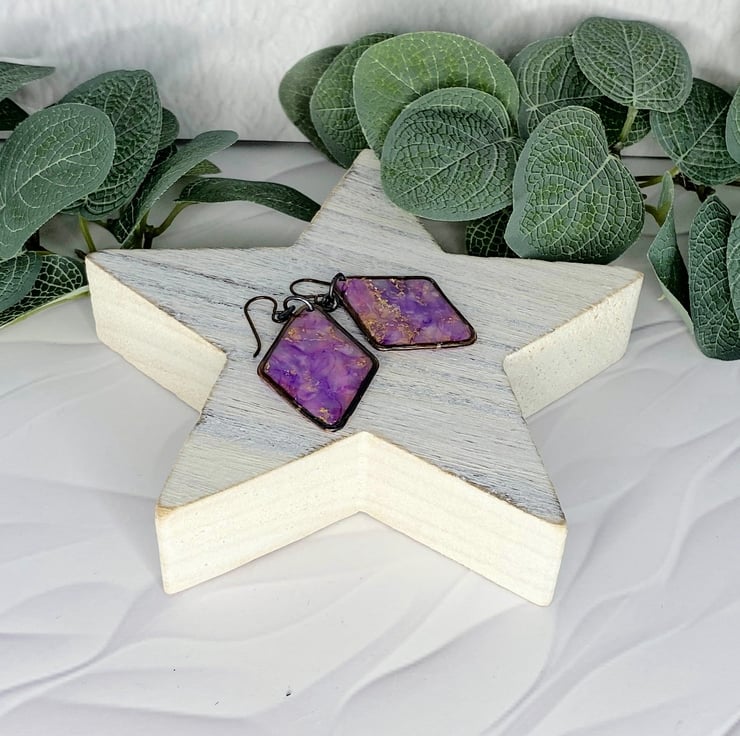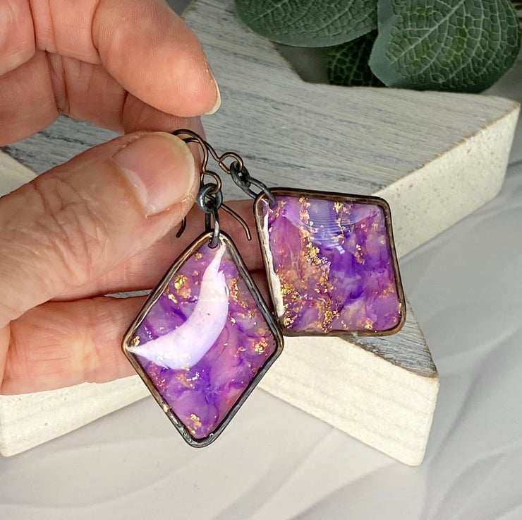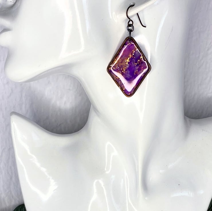 I started with the polymer clay, cutting and layering translucent clay with purple inks and copper metal leaf. Once the clay was cured I made the outer copper diamond shape with pure copper wire, soldered and hammerd then set the marbled clay with resin for a high gloss finish and to protect the clay. . Antiqued finish with hypoallergenic niobium ear wires.