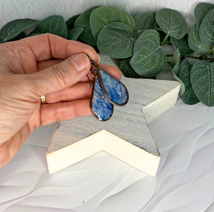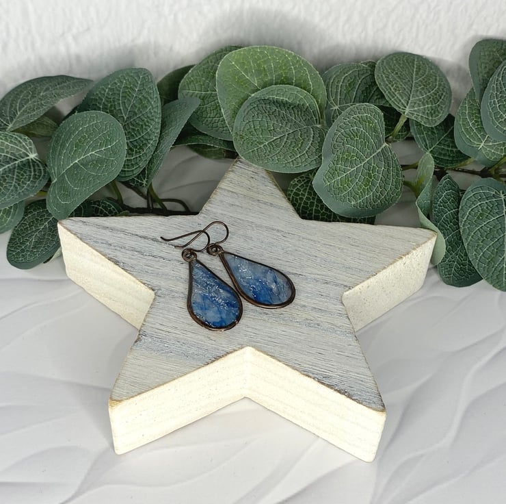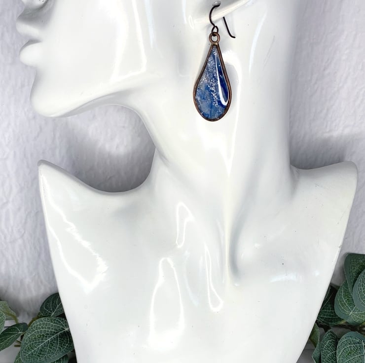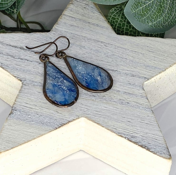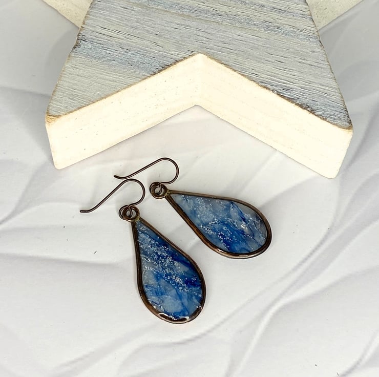 I started with the polymer clay, cutting and layering translucent clay with blue inks and silver metal leaf. Once the clay was cured I made the outer copper teardrop shape with pure copper wire, soldered and hammerd then set the marbled clay with resin for a high gloss finish and to protect the clay. . Antiqued finish with hypoallergenic niobium ear wires.