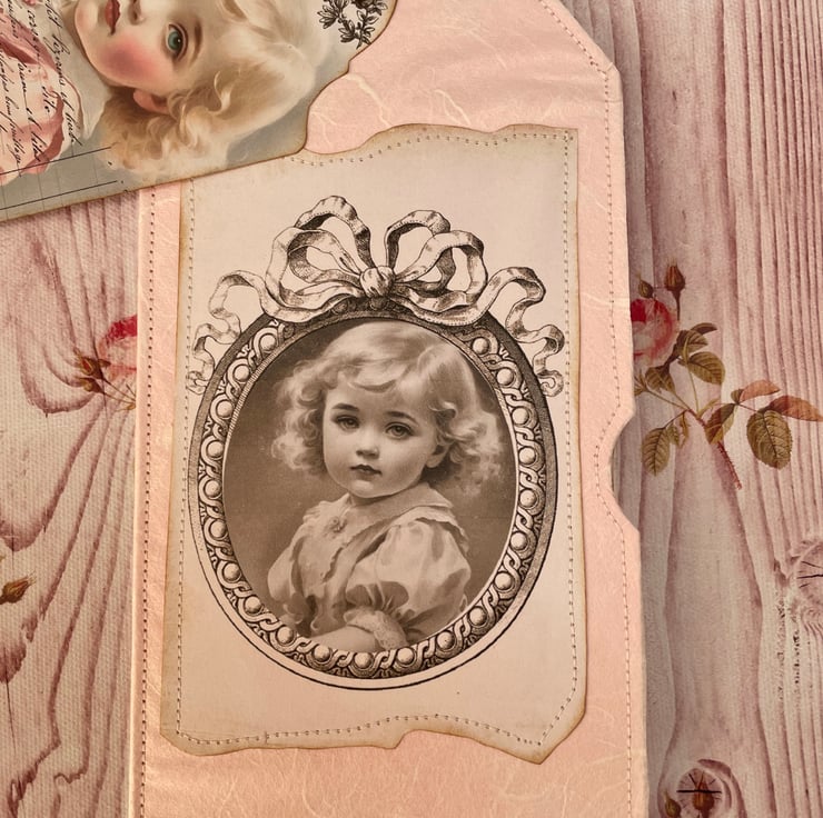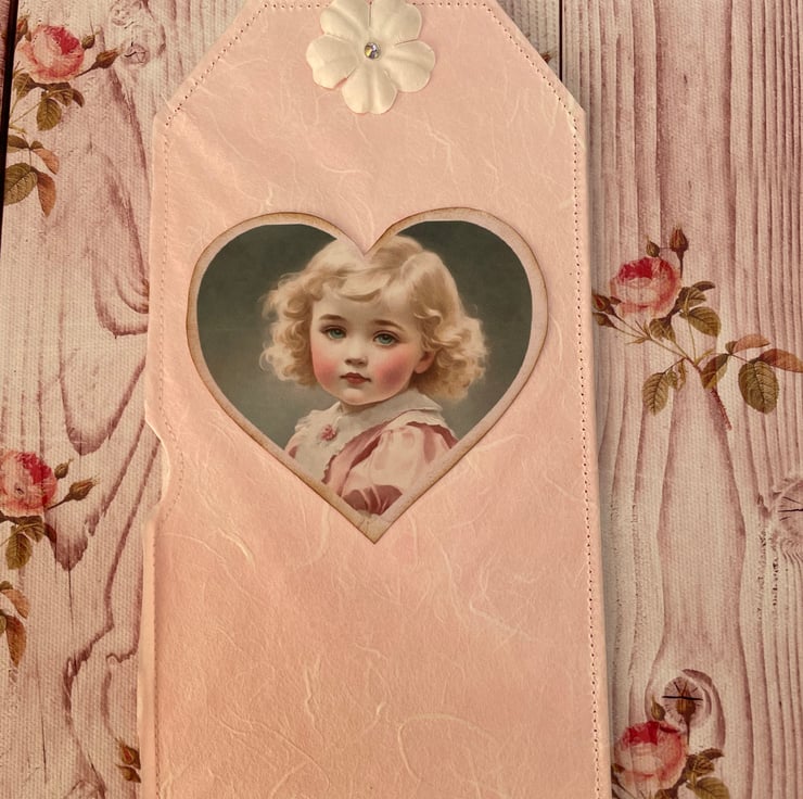 Pink card pocket tag covered with rice paper, stitched by machine. Pretty vintage style image on the front with a pastel coloured pretty girl, Jeanne, tag secured with a diamanté brad. Moves to showcase the image underneath. Back has pretty heart image and flower with diamanté centre. Inside the pocket has vintage style advertising pages, receipts etc. add to a journal or use as a bookmark.