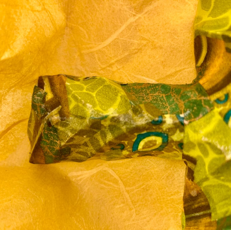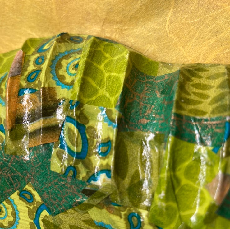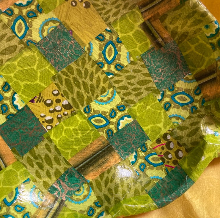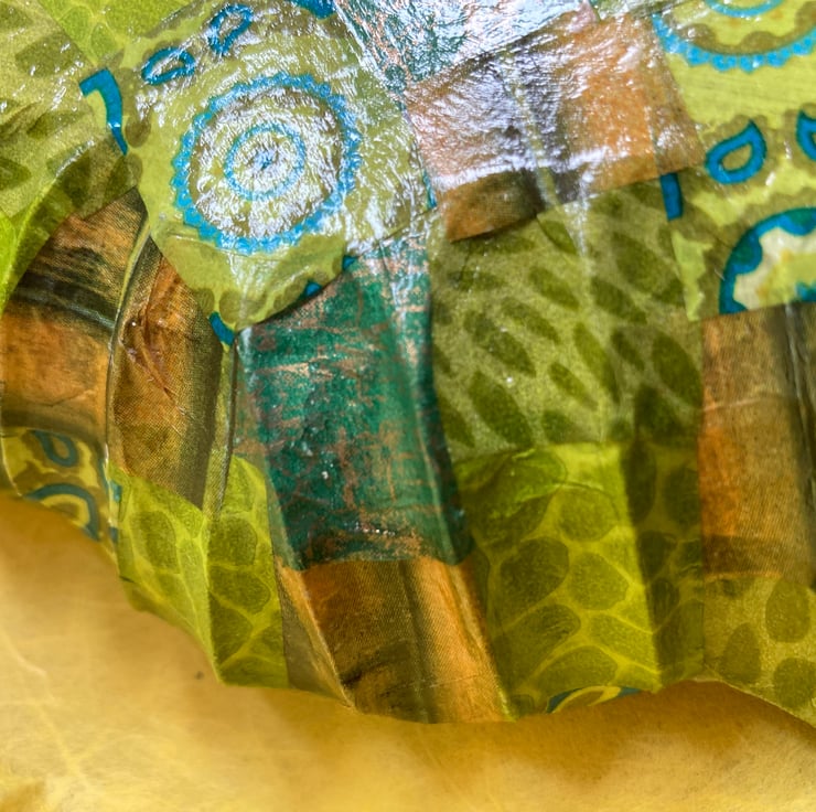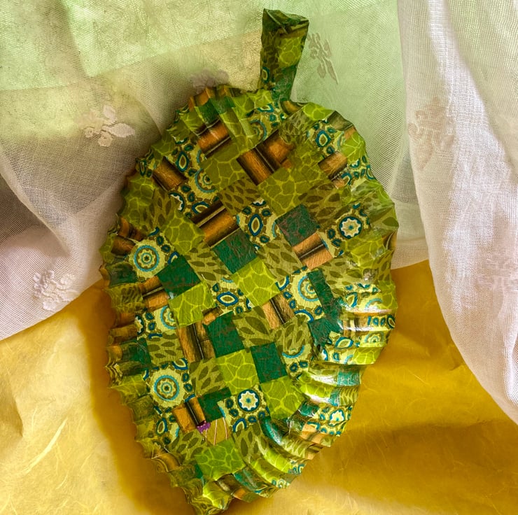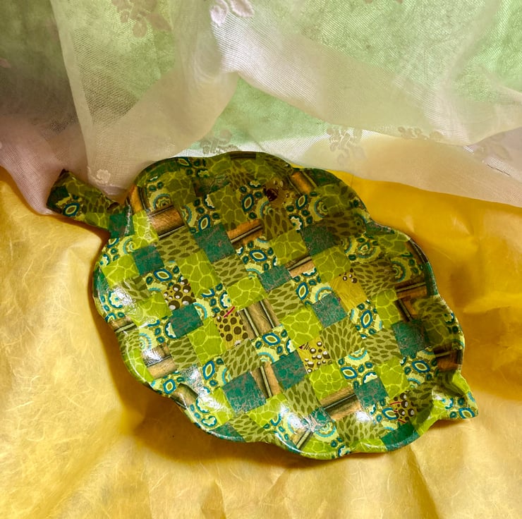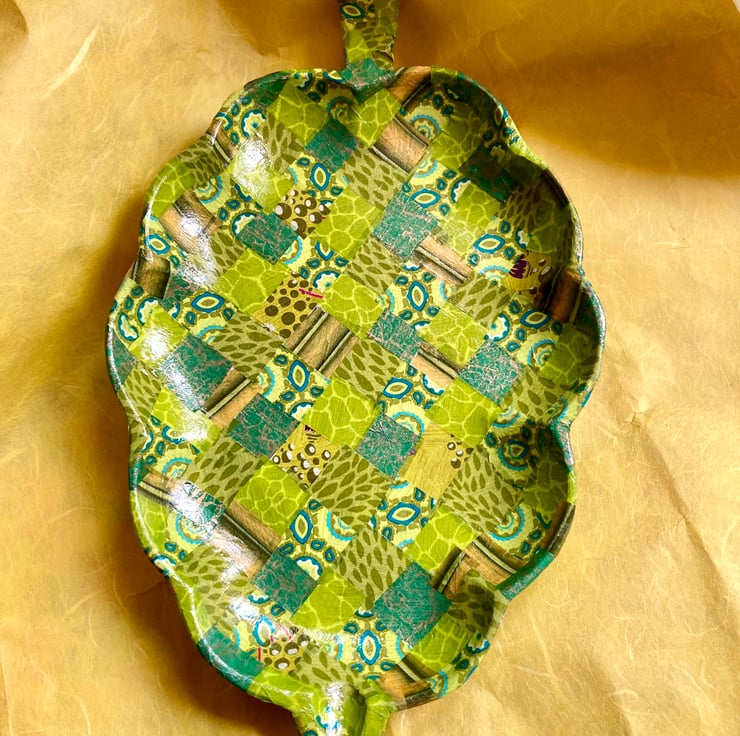 This up cycled wooden leaf shaped dish has been cleaned up and decopatched with a variety of green patterned papers. I love the shape of this which makes it lots of fun to do.