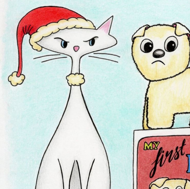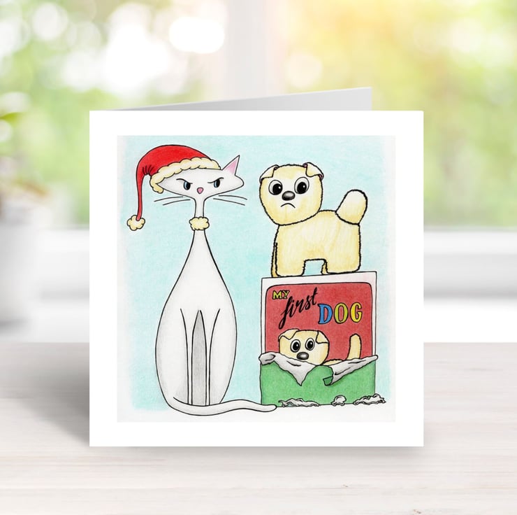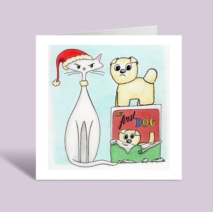 Fun cat Christmas card, this white kitty is not happy with this gift! An alternative Christmas card to send to your cat loving friends and family.