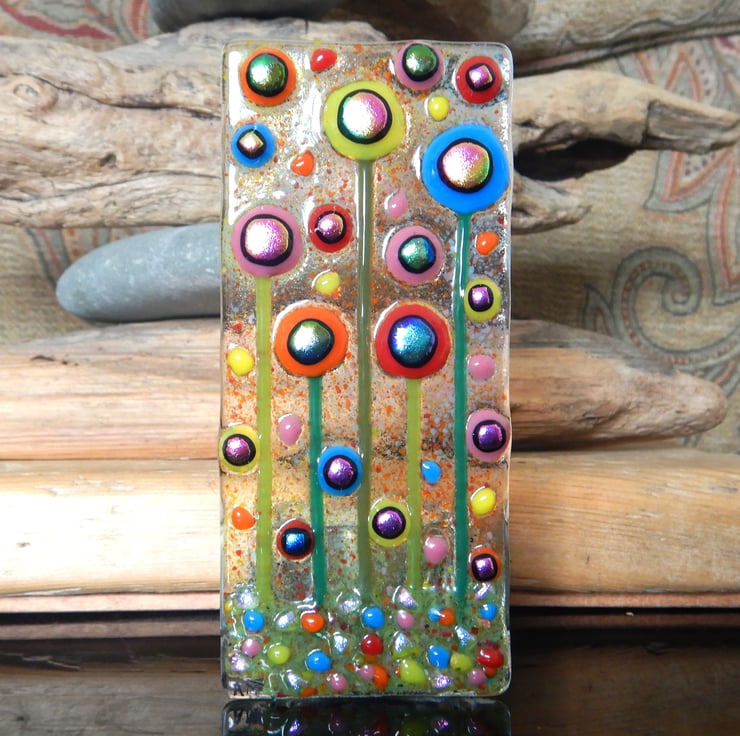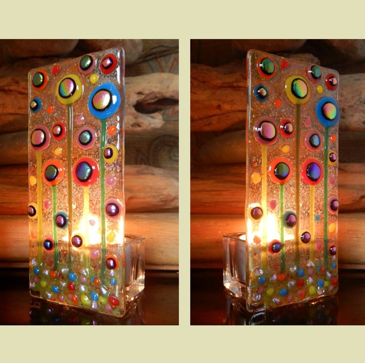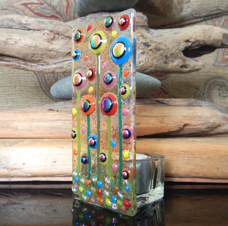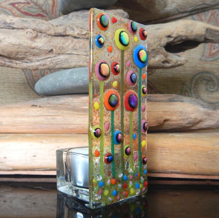 Lovely, bright, colourful, and cheerful T-light holder. Carefully made by myself using bullseye glass, dichroic glass, and frit glass. Each piece of glass was positioned carefully to make sure that the composition was balanced, and that it would have maximum visual impact.