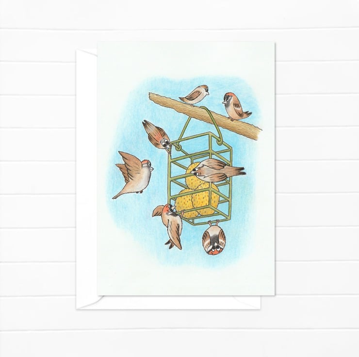 An original art greetings card featuring a hand-drawn pencil illustration of garden birds, enjoying their lunch.