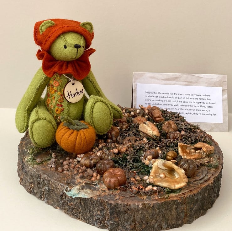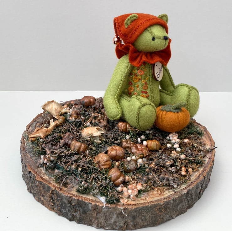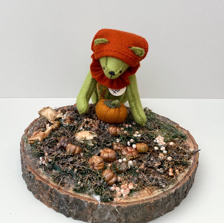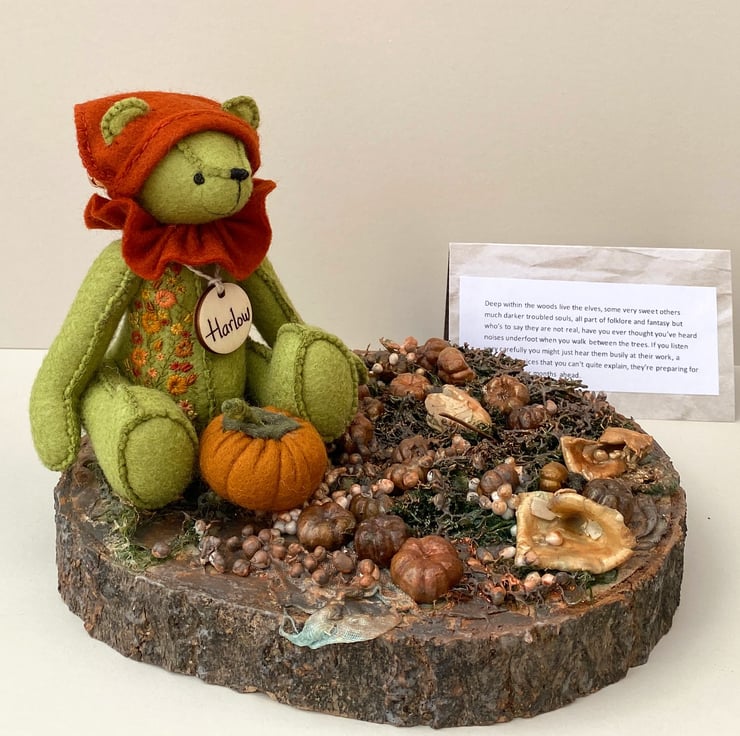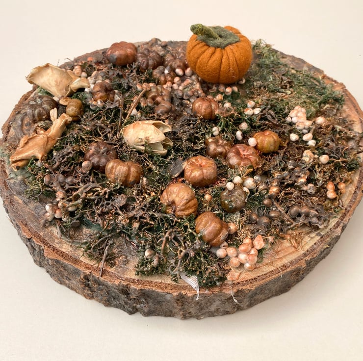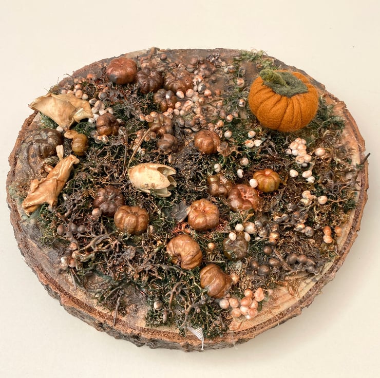 Harlow sits on the forest floor, a deep large wood slice measuring approx 25" diameter, decorated with fabrics, reindeer moss, green curly moss, miniature pumpkins, seeds and grasses. Set with with transparent fabric hardener then painted and dry brushed with pigments using bronze, copper and greens. Brushed with a clear varnished then sprayed again with a second coat of varnish to reach the inner pieces. Finished with a coat of modge podge to the bark edge and a little hand sewn felt pumpkin.