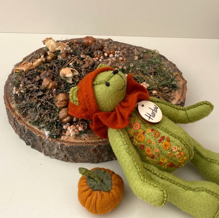 Harlow is approx 6.5" tall, one of my Signature style bears, made from wool felt in kiwi green and sewn 3 times to the right side of the fabric to ensure strength of seams. Decorated with hand embroidery in Autumn oranges, rusts and golds. Harlow has hand embroidered eyes and nose and is fully jointed with cotter pin fitments.