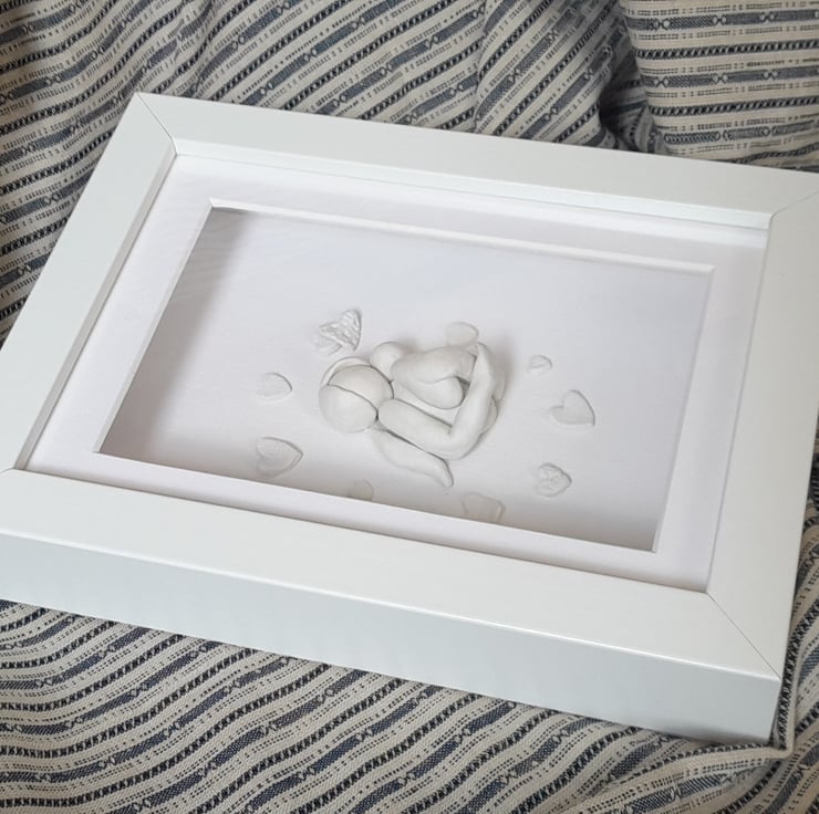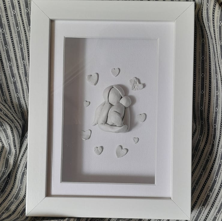 Created using air drying clay, this framed, three dimensional piece, depicts a mother holding a new-born baby, surrounded by love hearts.