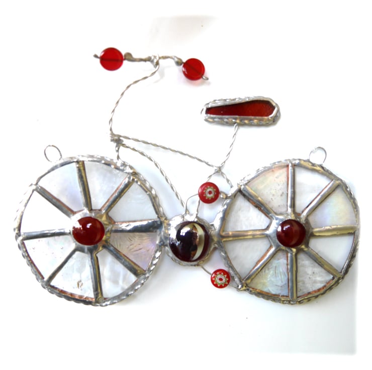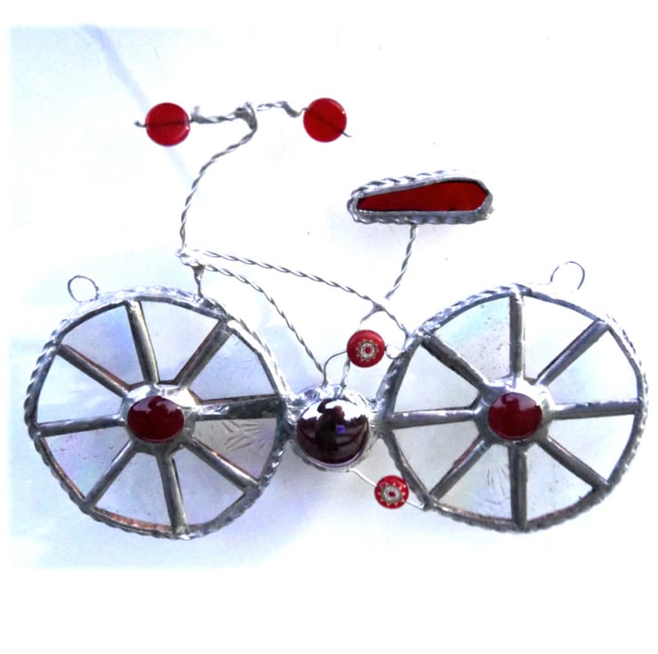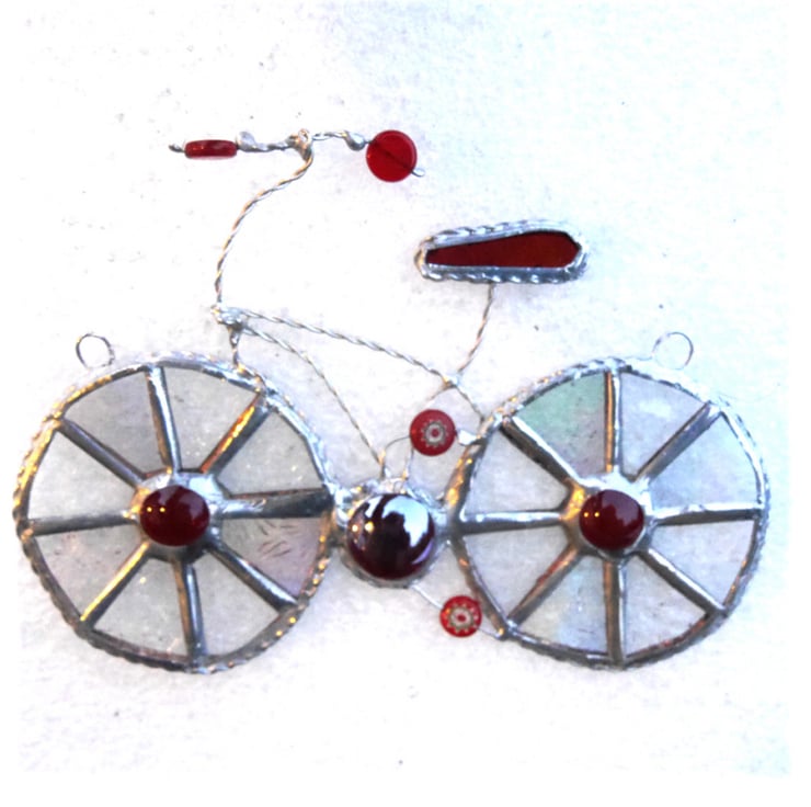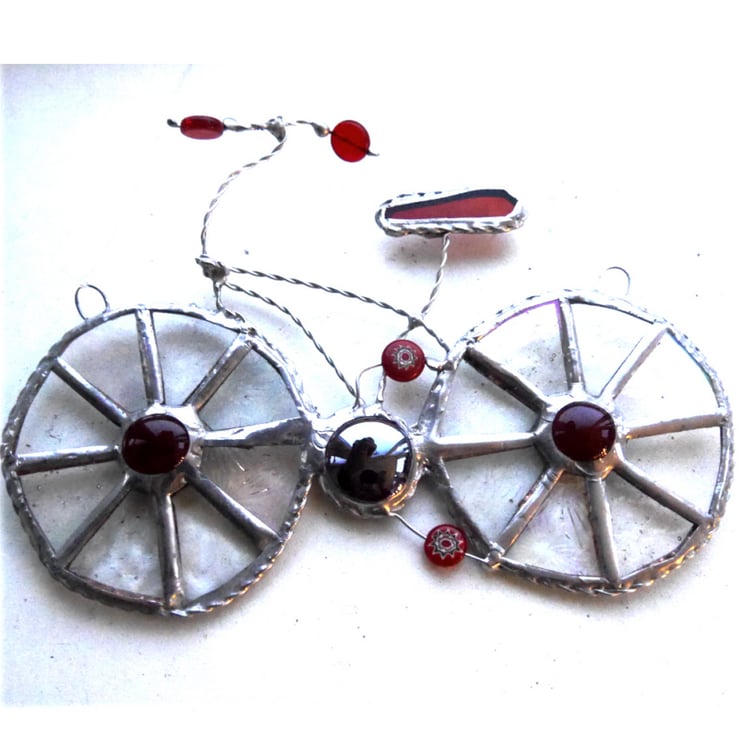 This is a stained glass suncatcher made entirely by hand using the Tiffany copper foil technique.