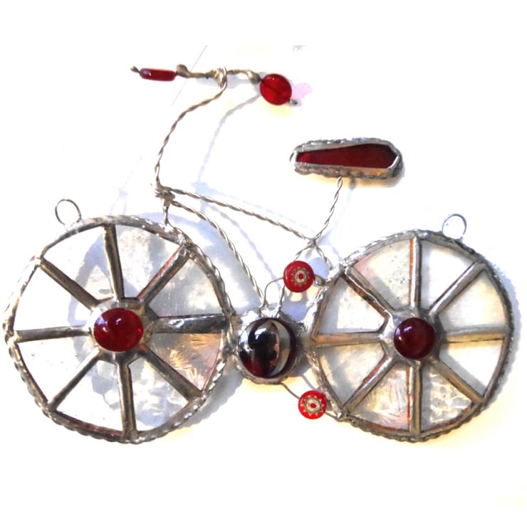 The bicycle hangs from a strong plastic line and looks quite amazing hanging in the window.