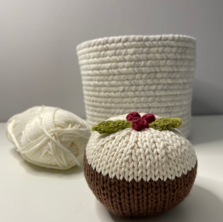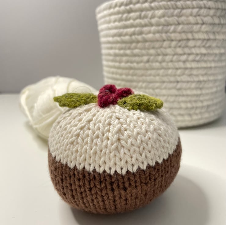 The Christmas puddings are knitted in one piece with a small seam to sew. Just fill with toy stuffing.