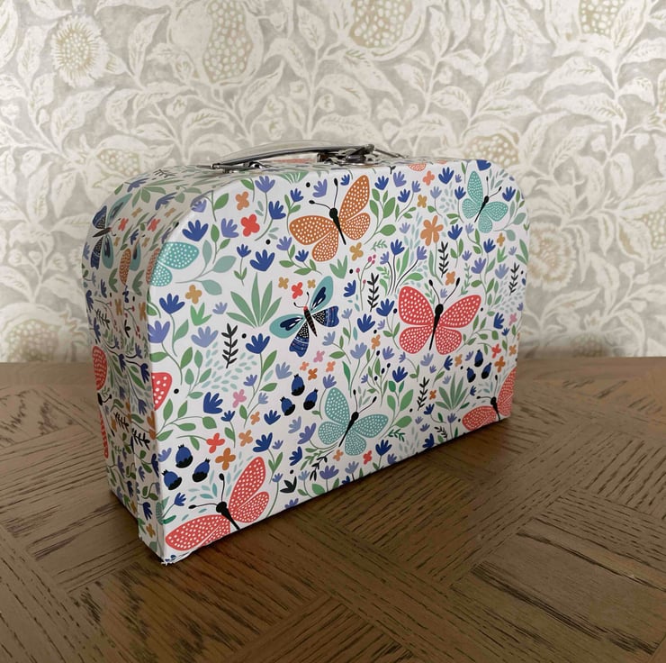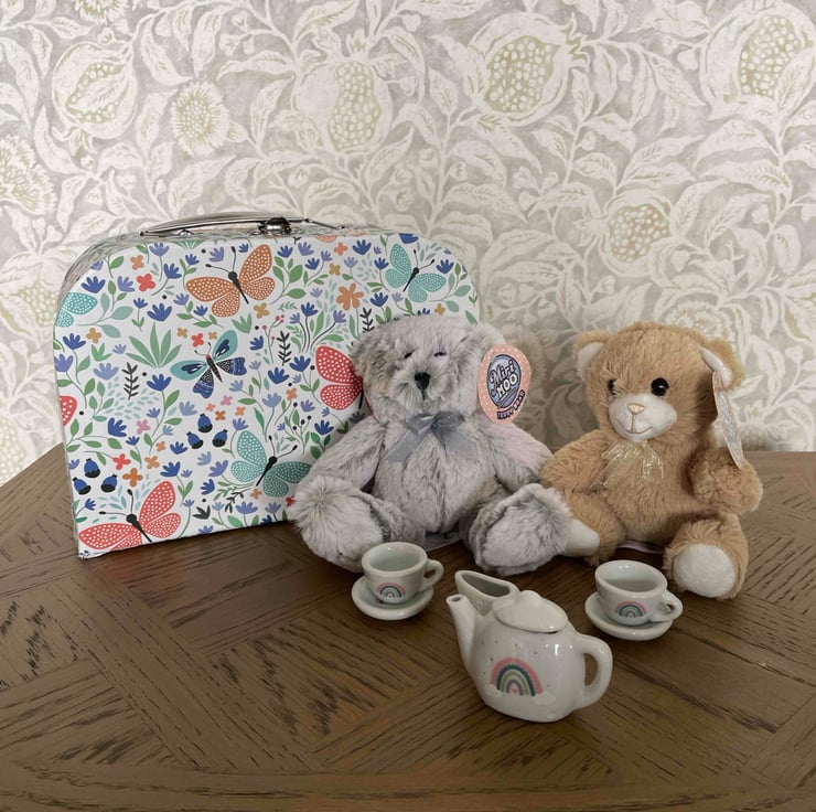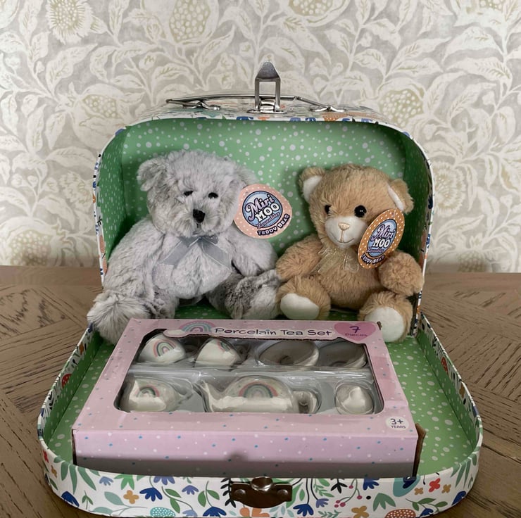 A lovely flowery suitcase containing 2 teddies and a little porcelain tea set. Perfect for playing teddy bear picnics. Not suitable for children under 3 years. Suitcase dimensions are 9.5 x 6.5 x 3 ins.