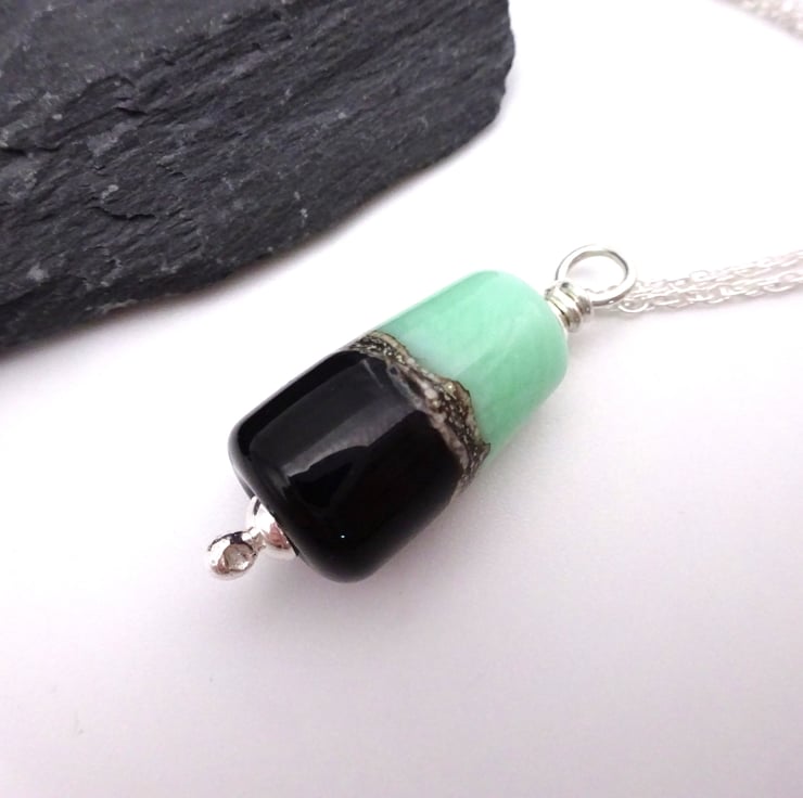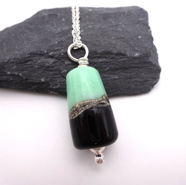 It features a sterling silver chain strung with a handmade lampwork glass pendant made with green and black glass.