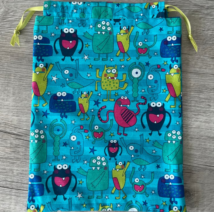 The cheerful alien themed drawstring bag can be used for useful storage.