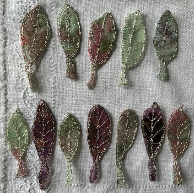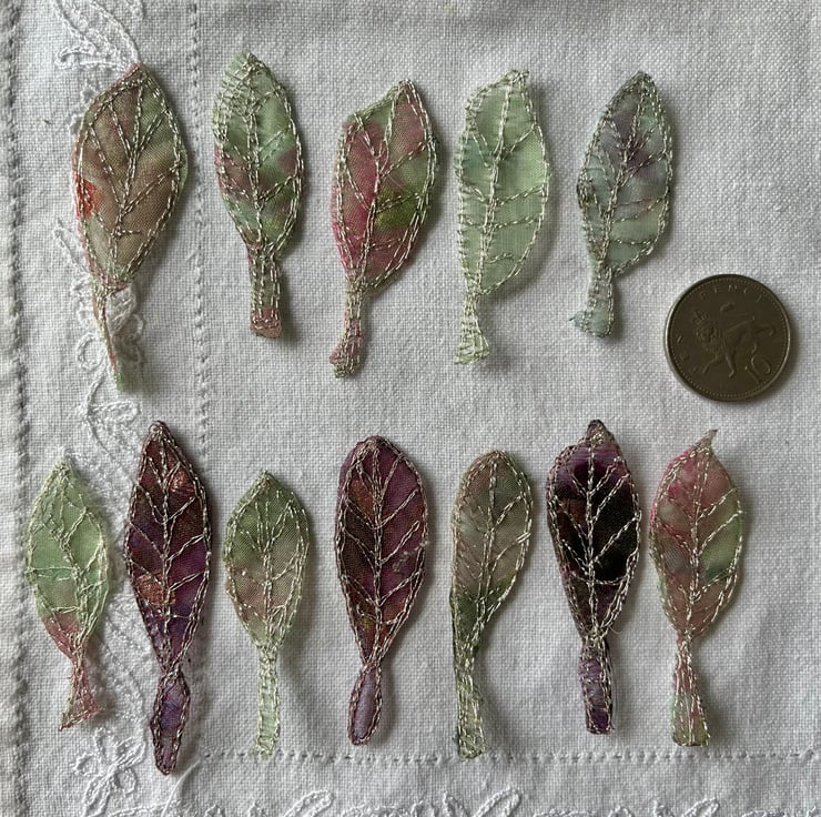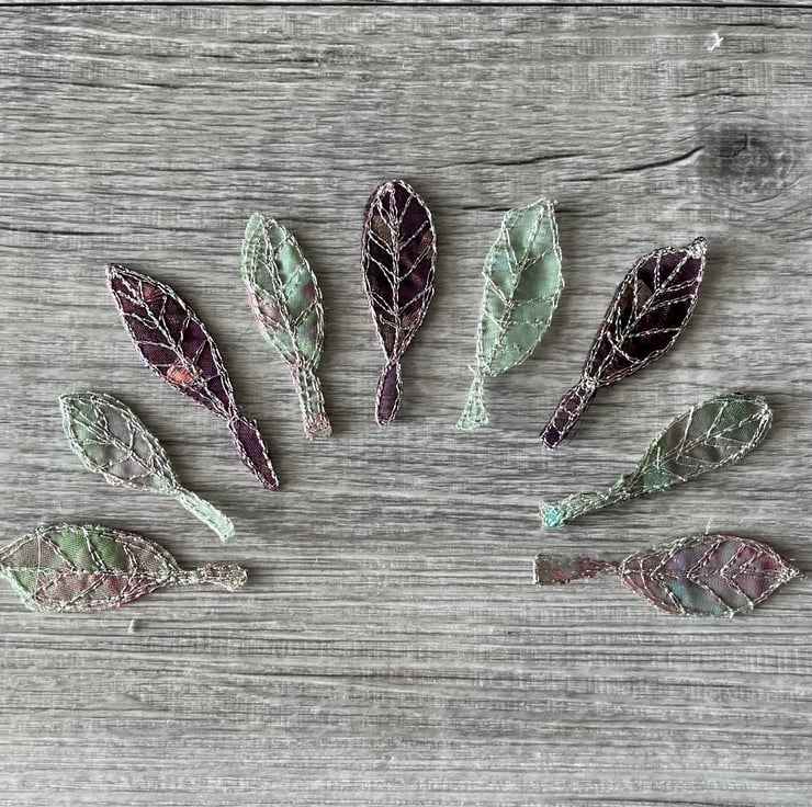 This mixed pack of 12 embellishments have been made by using free motion embroidery techniques - drawing with the sewing machine. Each one is slightly different from another, giving them a quirky and organic look. 3 are dark pink and 9 are green but have shades of pink within them. They are embroidered in silver metallic thread.
