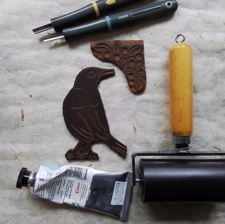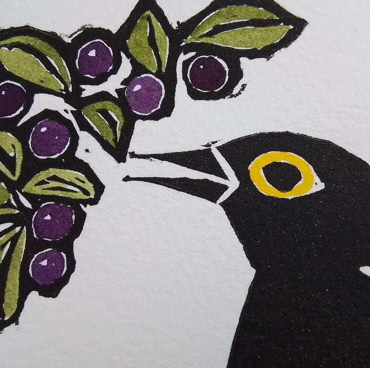 Linocut printed by hand on 100% cotton rag soft-white Somerset Velvet 250gsm and coloured with watercolour.