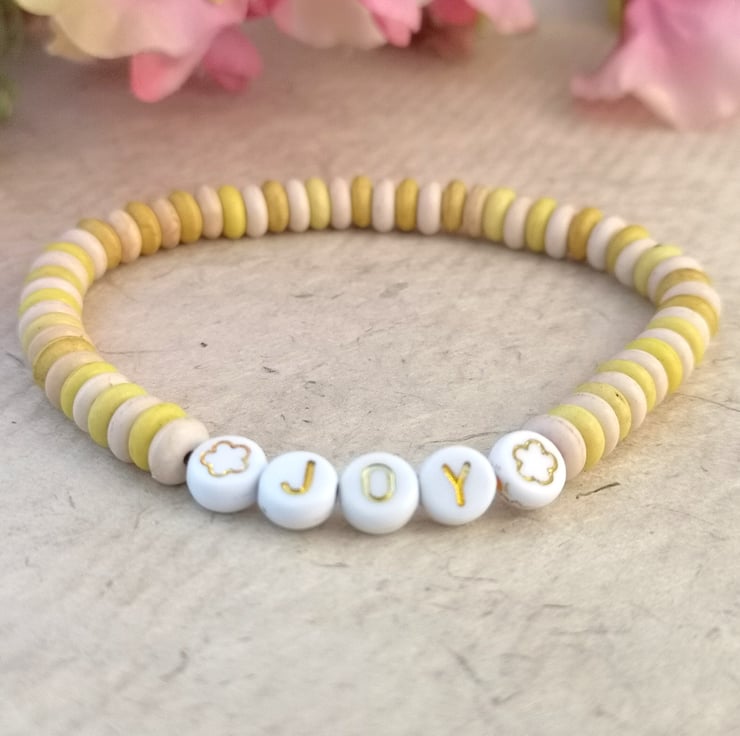 Embrace happiness with this "joy" affirmation bracelet, featuring a cheerful mix of yellow and cream howlite beads. Together these colours create a harmonious blend that radiates joy and lightness. The word "joy" is spelled out in letter beads serving as a daily reminder to find and cherish the happiness in every moment.