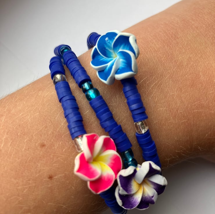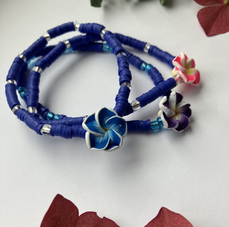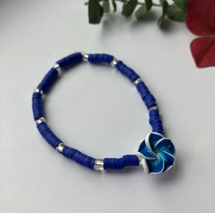 Beautiful summer-y bracelet made of clay & glass beads, with a blue frangipani flower feature.