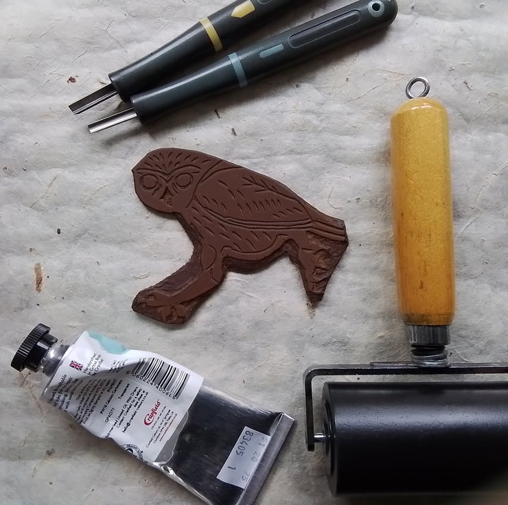 Linocut printed on 50% cotton rag soft-white Fabriano Unica 250gsm, hand coloured with watercolour.