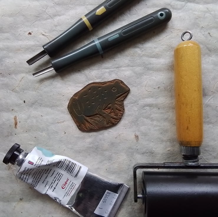 Linocut printed on Natural Lokta paper, mounted on 50% cotton rag soft-white Fabriano Unica 250gsm, with drawing and hand colouring.
