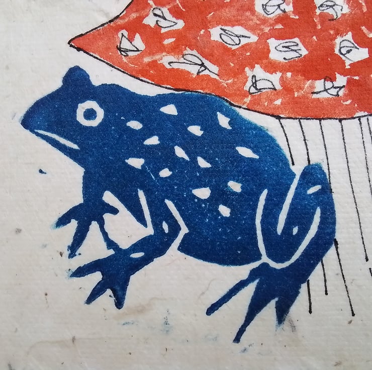 The eye-catching fly agaric funghi emerge in the Autumn and are a favourite food of snails ... I liked the idea of a frog sheltering under the funghi ... and not noticing the snail ...