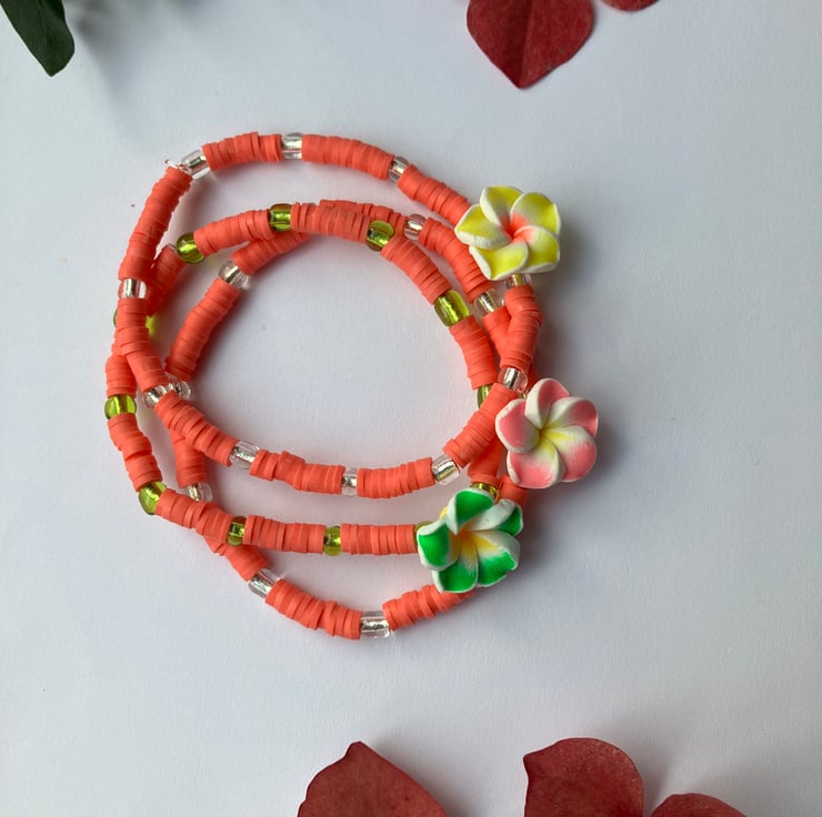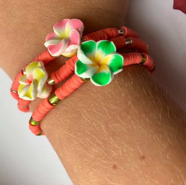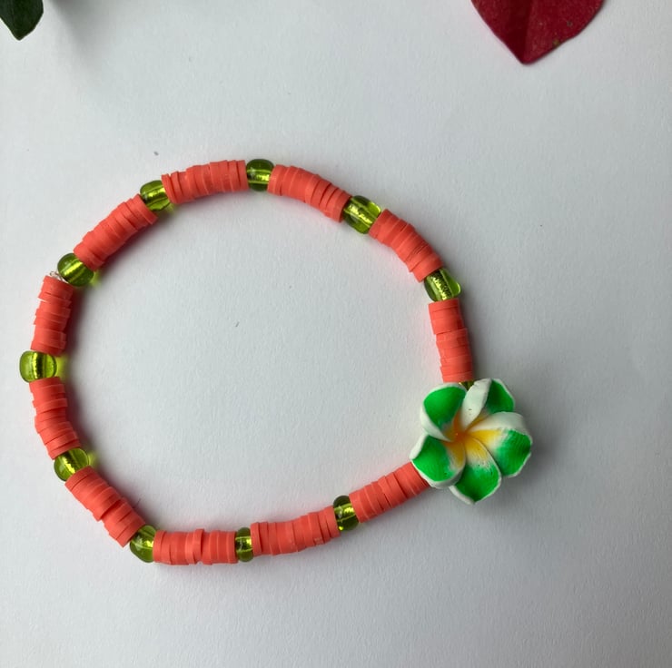 Beautiful summer-y bracelet made of clay & glass beads, with a green frangipani flower feature.